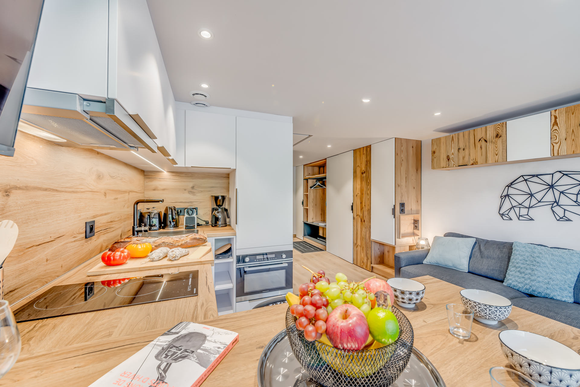 - Cuisine ouverte sur le sejour avec : 2 plaques induction, Refrigerateur avec partie freezer, four combine Micro-onde, Lave-vaisselle, 1 hotte