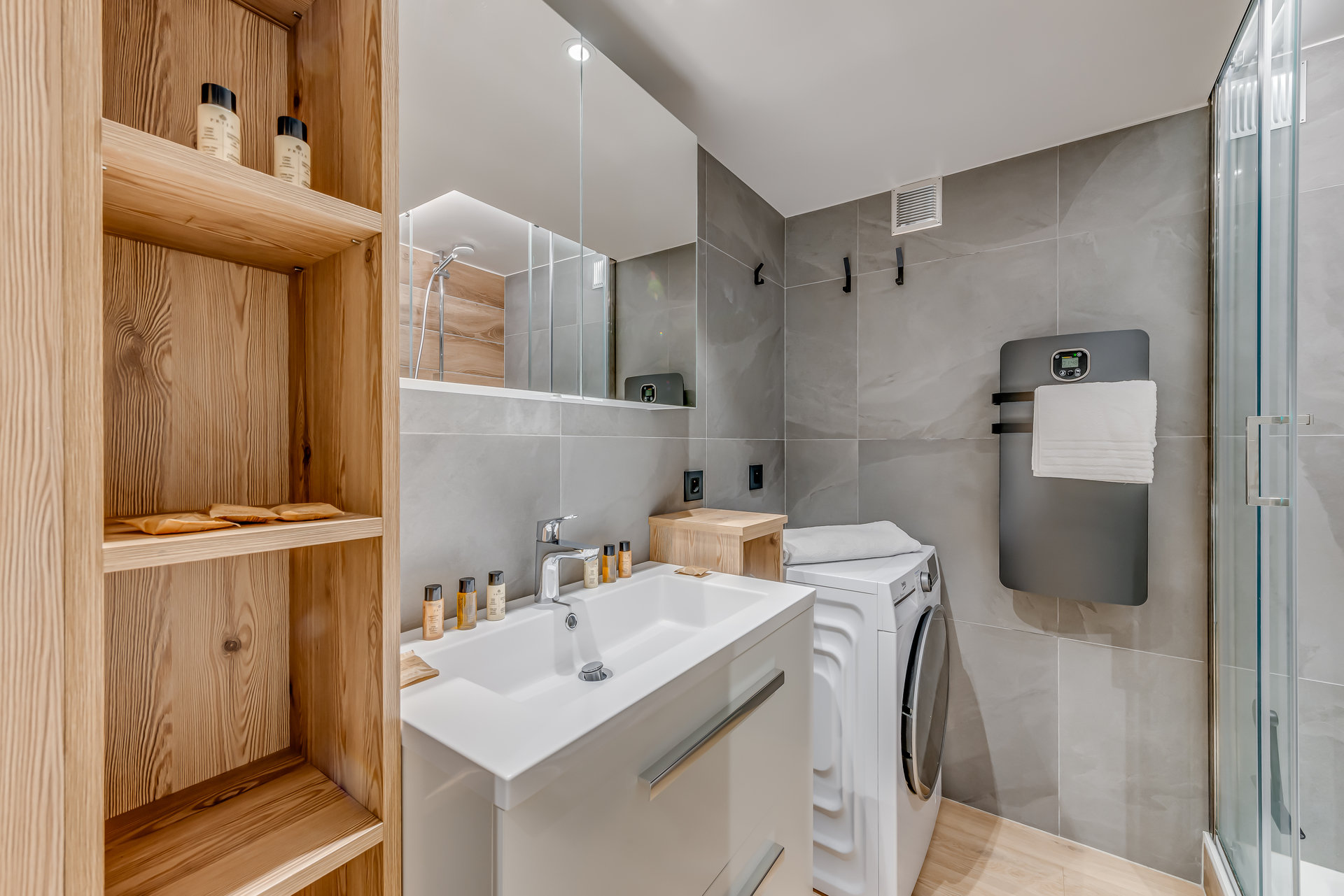 - Salle de bain avec meuble vasque, douche, WC, radiateur seche serviettes, lave-linge/seche-linge