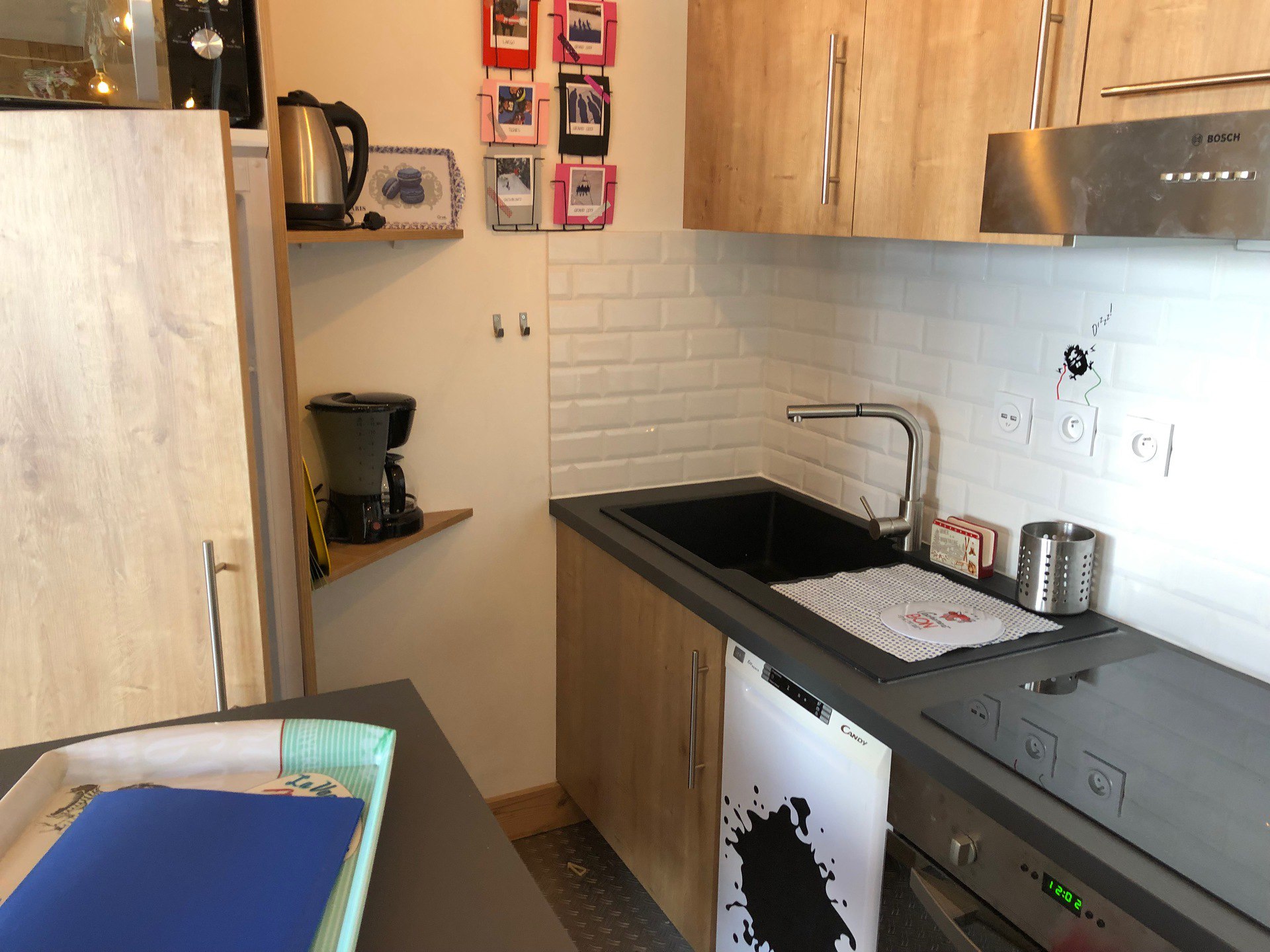 Cuisine : Plaques induction, four + four micro onde, réfrigérateur, lave-vaisselle et cafetière à filtre.