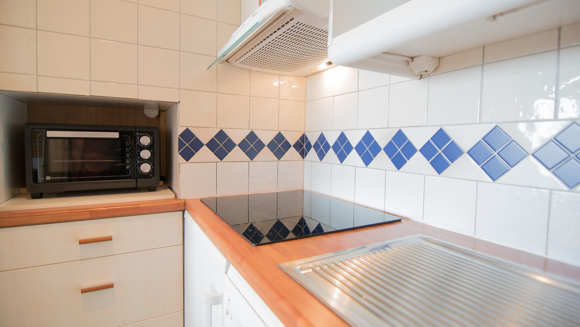 Cuisine : plaques vitrocéramiques, four, micro-ondes, réfrigérateur, lave-vaisselle et cafetière à filtre.
