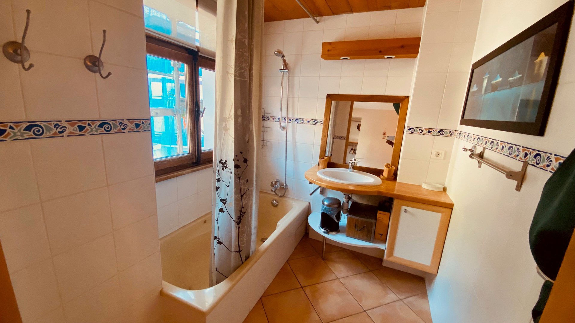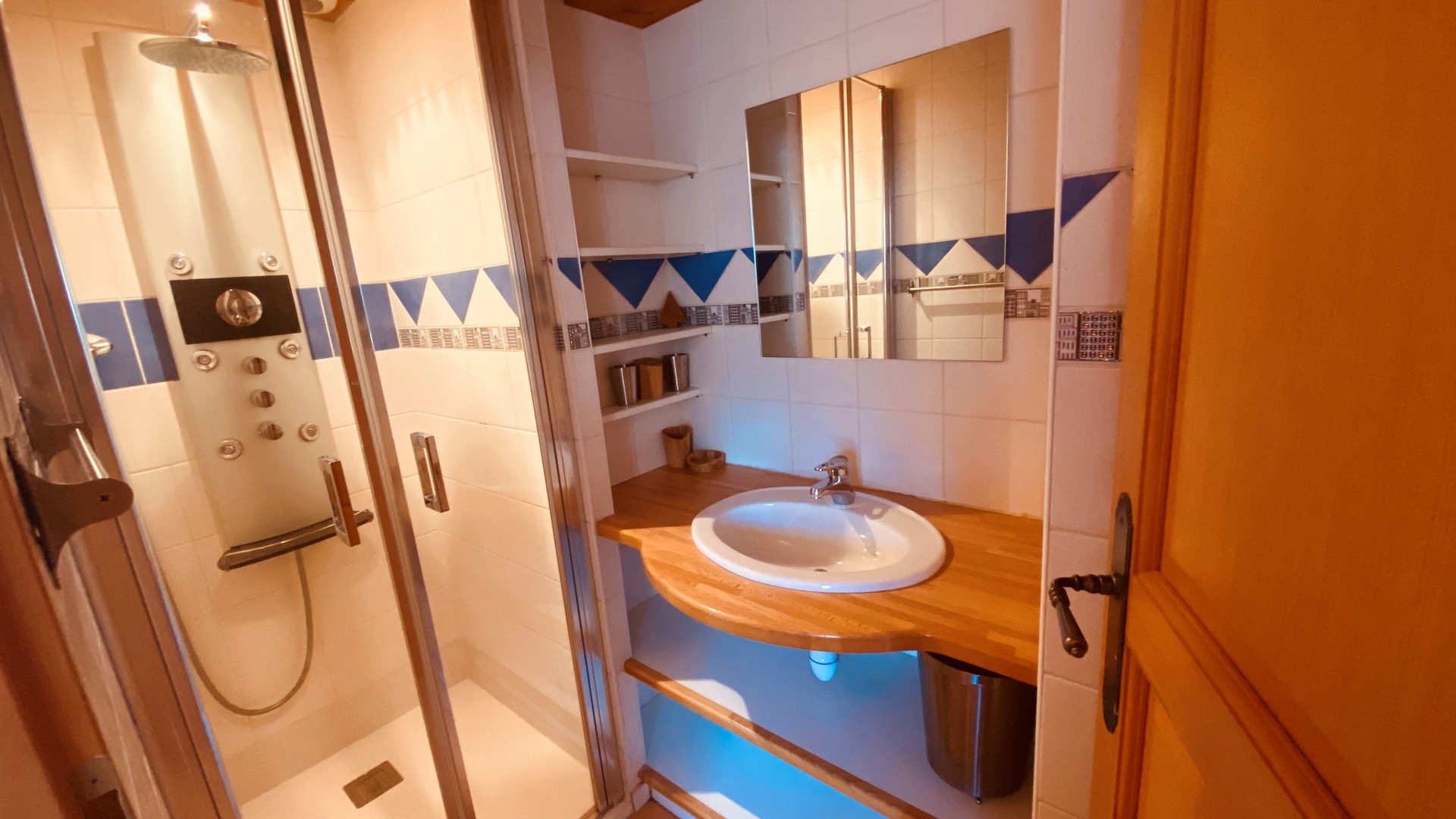 Entree / Hall (2.74m2) - wc - Chambre 1 (6.83m2) : Lit, penderie, fenetre nord vue village - Salle de bains (3.74m2) : Baignoire, lavabo, fenetre nord vue village - Chambre 2 (9.60m2): Lit, placard penderie, fenetre ouest vue village - Salle d'eau (2.87m2) : Douche, lavabo et lave-linge, etendage - Sejour (23.70m2): Coin cuisine equipee : Plaque induction 3 feux, frigo, micro-ondes, lave-vaisselle, cafetiere a filtre, grille-pain, appareil a raclette-pierrade, placards - Coin repas : Table et chaises - Coin salon : Canape, TV et table basse, porte fenetre + fenetre donnant acces balcon. Wifi.