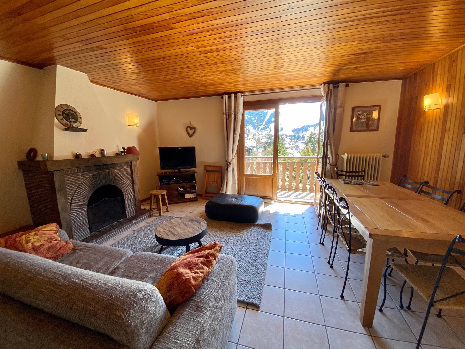 Entree sur Sejour (27 m2) avec Coin repas : Table et chaises - Coin salon : Banquette, fauteuils, table de salon, television, cheminee, baie vitree acces balcon sud - Cuisine equipee (6 m2): Four, lave-vaisselle, micro-ondes, 4 plaques electriques, refrigerateur (112L), cafetiere electrique a filtre, bouilloire, grille-pain, appareil a raclette-pierrade, appareil a fondue, placards, fenetre nord vue champ - Salle de bain : Baignoire, lavabo, fenetre nord - wc - Chambre 1 (9 m2) : 2 lits, penderie, fenetre nord vue batiment - Chambre 2 (9 m2) : 1 lit, penderie, fenetre sud vue montagne - Coin nuit (4m2) : lits et placard