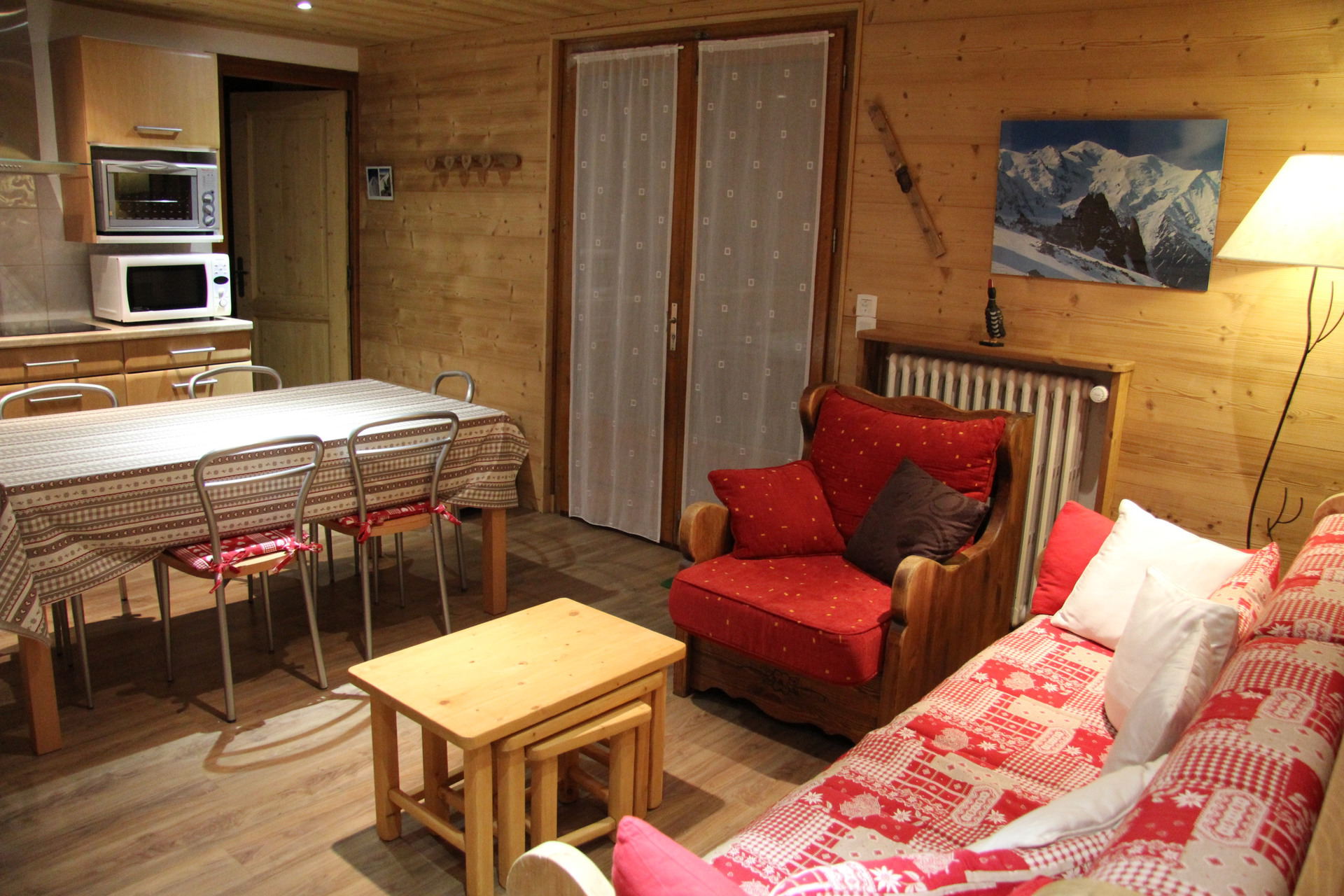 Entree / Hall sur sejour (20 m2) : Coin repas : Table et chaises - Coin salon : Canape, table de salon, fauteuil, television, porte-fenetre acces terrasse ouest vue montagne - Coin cuisine equipee : Four multifonction, micro-ondes, plaques vitroceramiques 3 feux, hotte, lave-vaisselle, refrigerateur (140L), placards, porte fenetre acces terrasse bois - Chambre 1 (10 m2) : 2 lits, placards, television, 2 fenetres sud et ouest vue montagne - Salle d'eau : Douche a l'italienne, lavabo, lave-linge, radiateur seche-serviettes - wc - Chambre 2 (7 m2) : 1 lit, placards, fenetre ouest vue montagne.
