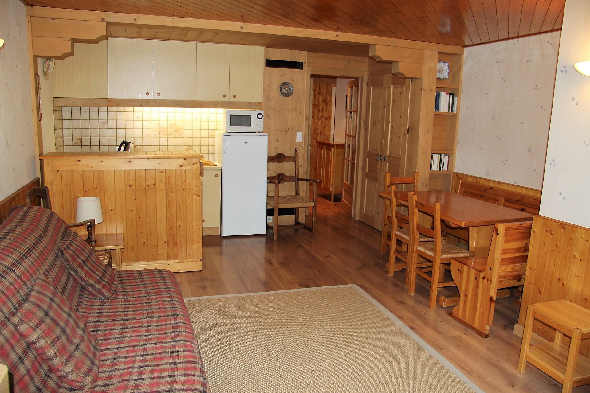Entree / Hall (5 m2) desservant : Chambre 1 (5.58 m2) : 2 lits, placard, fenetre nord vue village - Chambre 2 (9.50 m2) : 2 lits, placard, fenetre nord vue village - Salle d'eau : Douche, lavabo, seche-serviettes electrique - wc - Sejour (22 m2) avec Coin repas : Table et chaises - Coin cuisine equipee : Cuisiniere electrique avec four et plaques vitroceramiques, refrigerateur (112L), lave-vaisselle, micro-ondes, placards - Coin salon : Canape, television, baie vitree acces balcon sud vue montagne.