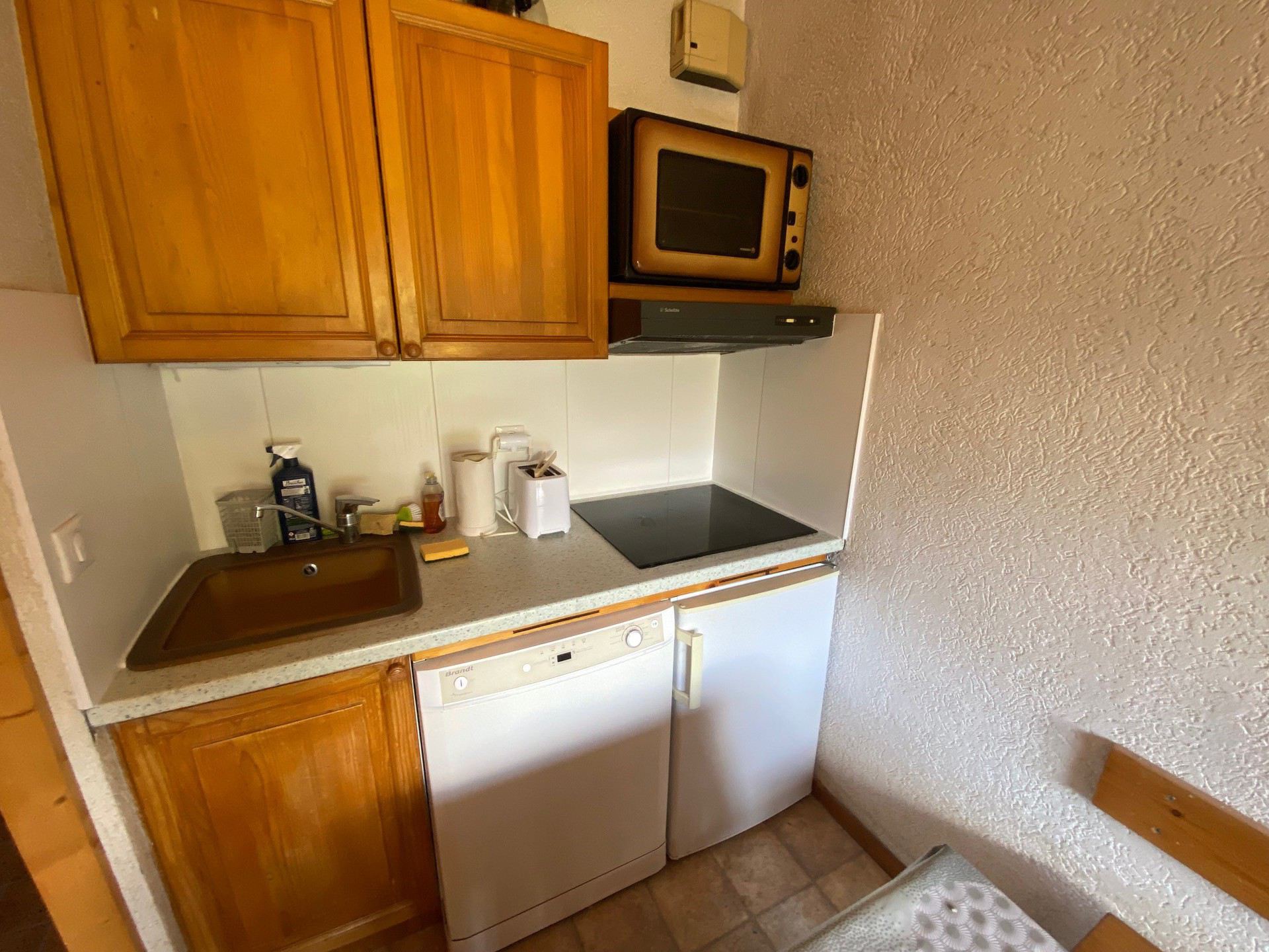 Entree/Hall : Placard - Chambre en partie mansardee (9,40 m2 dont 7 m2<1.80) : 2 lits, velux - Chambrette (4,70 m2) : 1 lit, fenetre sur coursive - Coin nuit (4 m2) en couloir : 2 lits - Salle d'Eau : Douche, lavabo - wc - Sejour (12 m2) avec Coin salon : Canape, television, table basse, baie vitree acces balcon sud vue village - Coin repas : Table et chaises - Coin cuisine equipee : Plaque electrique 4 feux, refrigerateur, lave-vaisselle, placards.