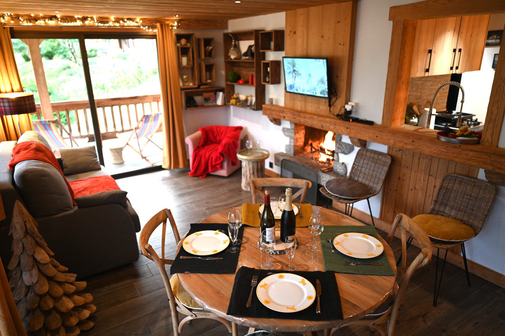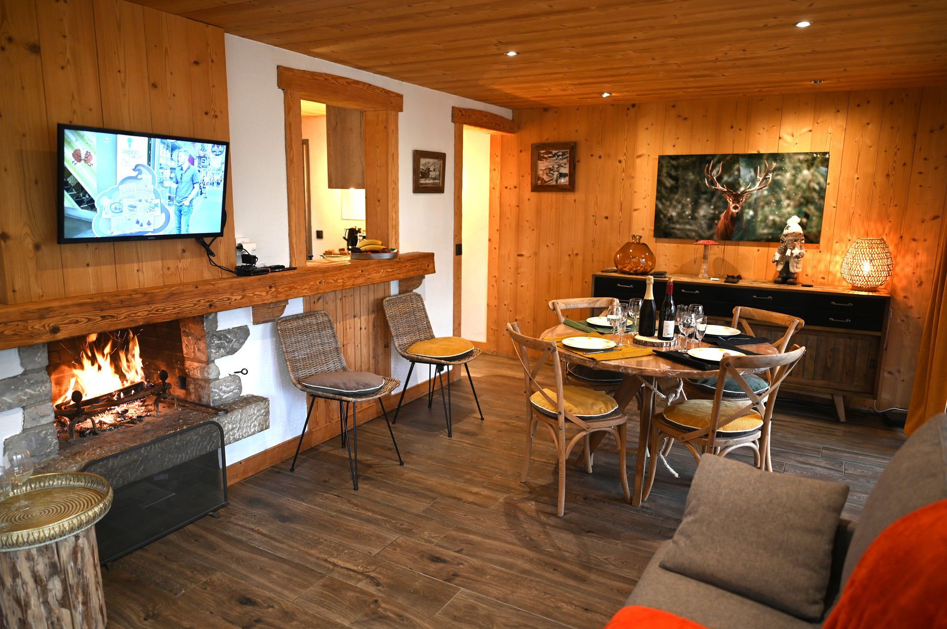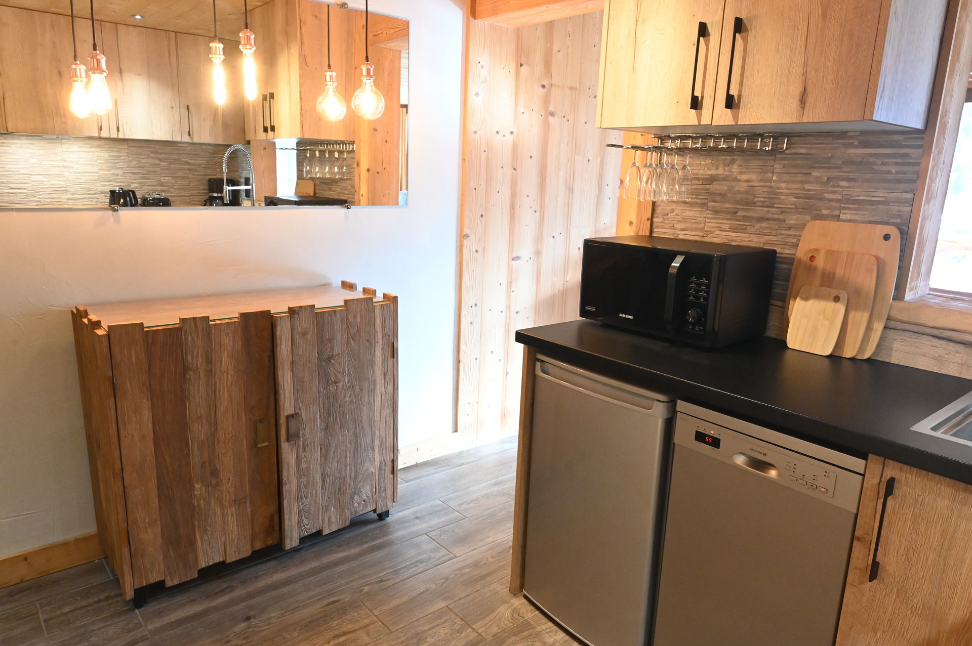 Entree/Hall : wc - Cuisine (10 m2) : Plaques 4 feux gaz, four, micro-ondes, lave-vaisselle, refrigerateur (80L), cafetiere a filtre, bouilloire, grille-pain, appareil a raclette, placards - Salle de sejour (20 m2) avec coin repas : Table et chaises - Coin salon : Canape, television, cheminee (insert), porte fenetre acces balcon-terrasse vue village et chaine des Aravis - Chambre 1 (14 m2 ) : lit, penderie, fenetre nord, vue chalet, lavabo avec miroir mural, douche a l'italienne - Chambre 2 (7.60m2) : Lits, lavabo, douche, penderie, baie acces terrasse et fenetre Sud Est - mobilier de jardin : table haute avec tabouret, 2 transats - Parking exterieur 1 voiture - Buanderie avec lave-linge - Barbecue Weber l'ete - Chauffage central au fuel + solaire - Couettes - Animaux interdits.
