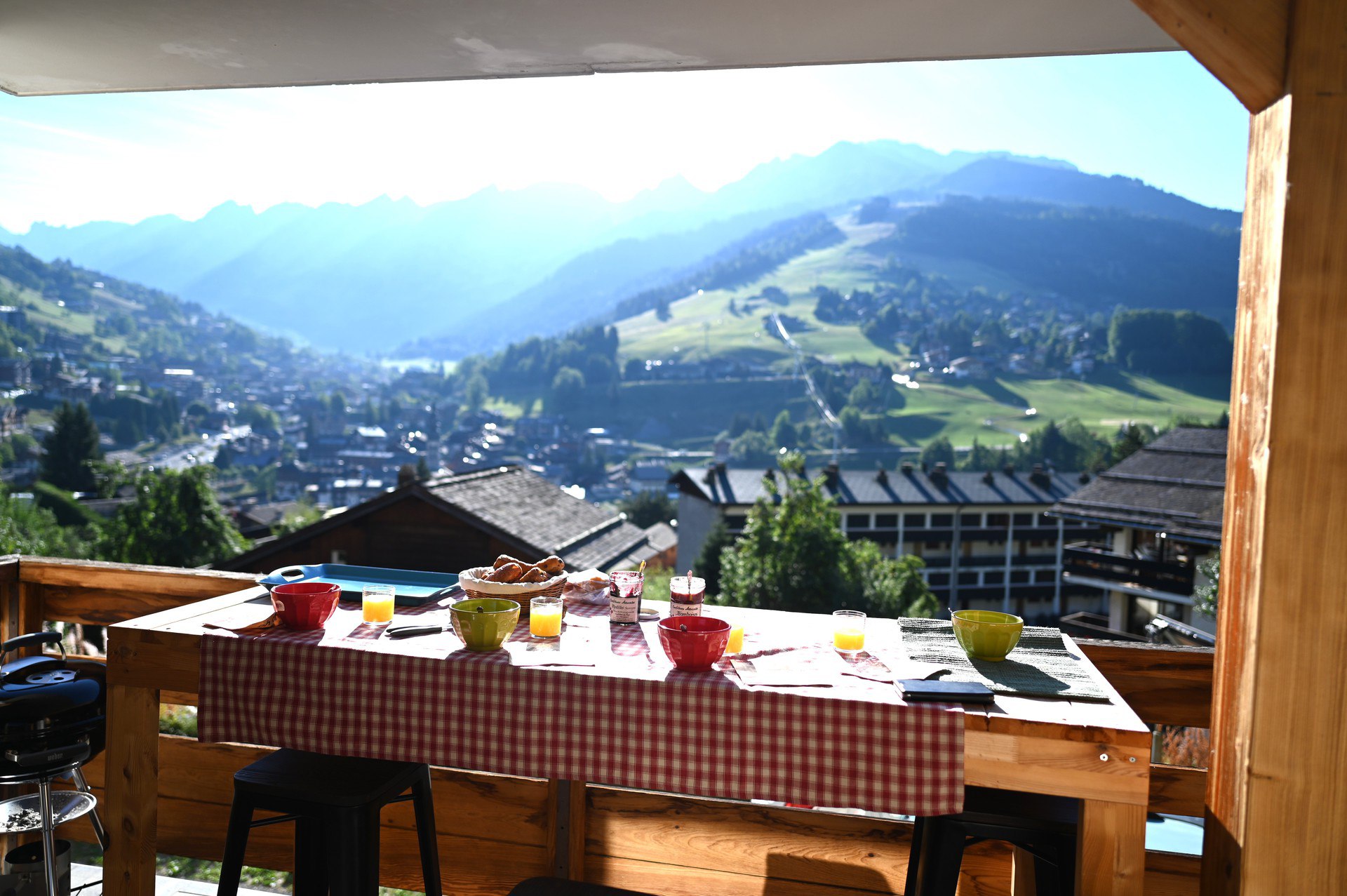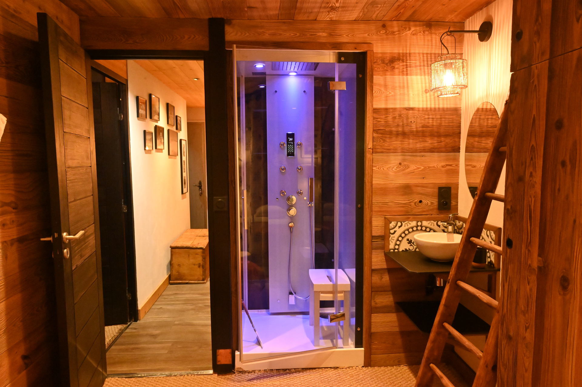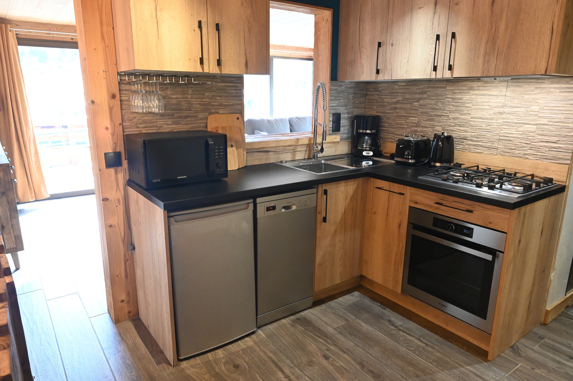 Entree/Hall : wc - Cuisine (10 m2) : Plaques 4 feux gaz, four, micro-ondes, lave-vaisselle, refrigerateur (80L), cafetiere a filtre, bouilloire, grille-pain, appareil a raclette, placards - Salle de sejour (20 m2) avec coin repas : Table et chaises - Coin salon : Canape, television, cheminee (insert), porte fenetre acces balcon-terrasse vue village et chaine des Aravis - Chambre 1 (14 m2 ) : lit, penderie, fenetre nord, vue chalet, lavabo avec miroir mural, douche a l'italienne - Chambre 2 (7.60m2) : Lits, lavabo, douche, penderie, baie acces terrasse et fenetre Sud Est - mobilier de jardin : table haute avec tabouret, 2 transats - Parking exterieur 1 voiture - Buanderie avec lave-linge - Barbecue Weber l'ete - Chauffage central au fuel + solaire - Couettes - Animaux interdits.