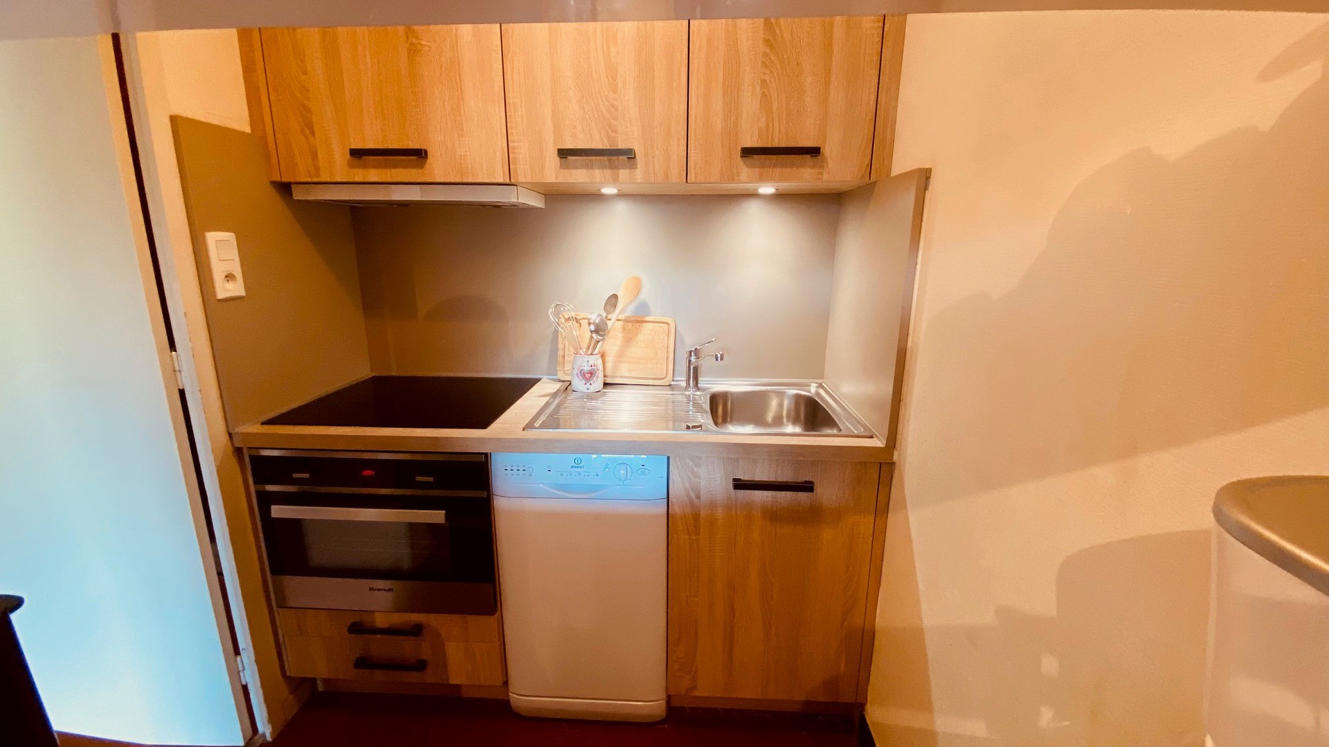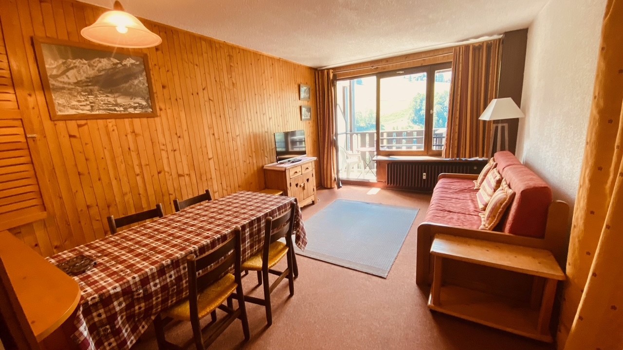 Entree/Hall (4.65 m2) : Placard penderie - wc - Sejour (15 m2) avec Coin salon : Canape, television, table basse, baie vitree acces balcon sud - Coin repas : Table et chaises - Coin cuisine equipee (3 m2) : Cuisiniere electrique avec four, refrigerateur (100L), lave-vaisselle, micro-ondes, machine a cafe Tassimo, placards, bar passe-plat - Chambre (9.56 m2) : 2 lits, placard, porte fenetre + fenetre sud vue village - Salle de bains : Baignoire, lavabo, lave-linge - Coin nuit couloir (4.50 m2) : lit - Placard (1.50 m2)