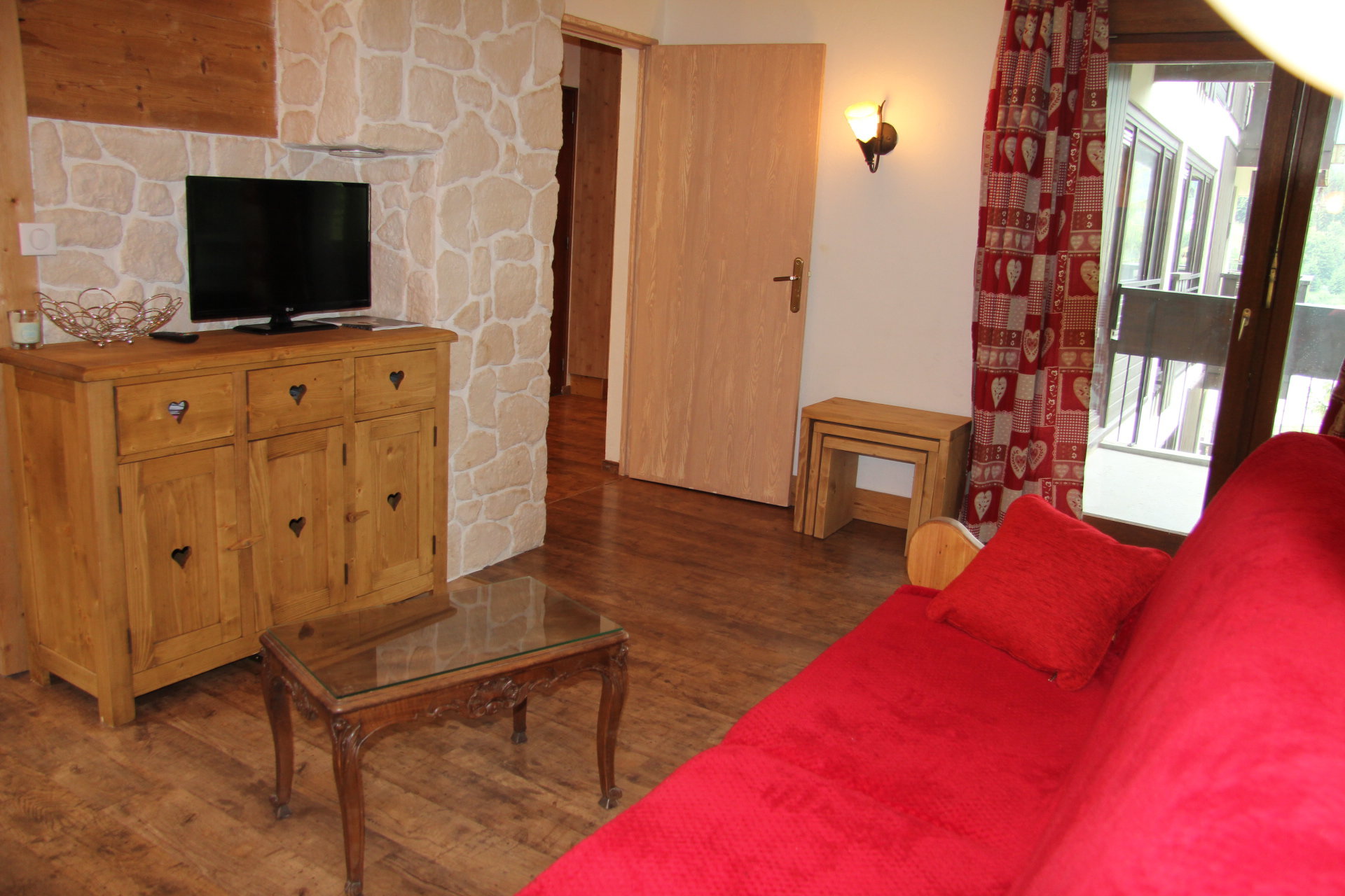 Entree/Hall : Placard penderie - Salle de bains : Douche, lavabo - wc - Chambre (10 m2) : 3 lits, penderie, fenetre + porte fenetre ouest vue village - Salle de sejour (19 m2) avec Coin salon : Canape, television, table basse - Coin repas : Table et chaises - Cuisine equipee : 3 plaques induction, four, four micro ondes, lave-vaisselle, frigo, hotte, placards de rangement.