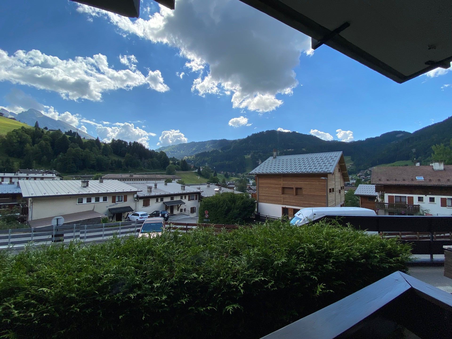 Entree/Hall - Sejour (13 m2) avec Coin salon : Canape, television, table basse, baie vitree acces balcon sud avec vue sur le village et les pistes - Coin repas : Table et chaises - Coin cuisine equipee (3 m2) Trio (plaques + lave-vaisselle + four), micro-ondes, refrigerateur (100L), placards, passe-plat - Chambre (8.96 m2) : 2 lits, placard, porte fenetre + fenetre sud avec vue sur le village - Salle de bains : Cabine douche, lavabo, lave-linge sechant - wc
