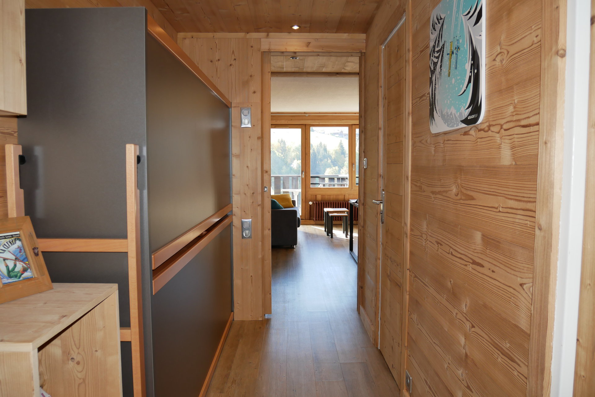 Entree/Hall : Placard penderie - wc - Salle de bains : Baignoire, lavabo, lave-linge, seche-serviettes - Chambre (9,80 m2) : 1 lit, placard, porte fenetre + fenetre nord acces balcon vue batiment - Sejour (16,90 m2) avec Coin salon : Canape, TV d'orange, table basse, baie vitree acces balcon sud - Coin repas : Table et chaises - Coin cuisine equipee : Plaque induction 3 feux, four, micro-ondes, lave-vaisselle, refrigerateur (100L), appareil a raclette et fondue, machine a cafe filtre + Nespresso, bouilloire, grille-pain. Couettes - Casier a skis - Chauffage collectif fuel - Animaux non autorises - WIFI - Televison Orange - Appartement non fumeur.