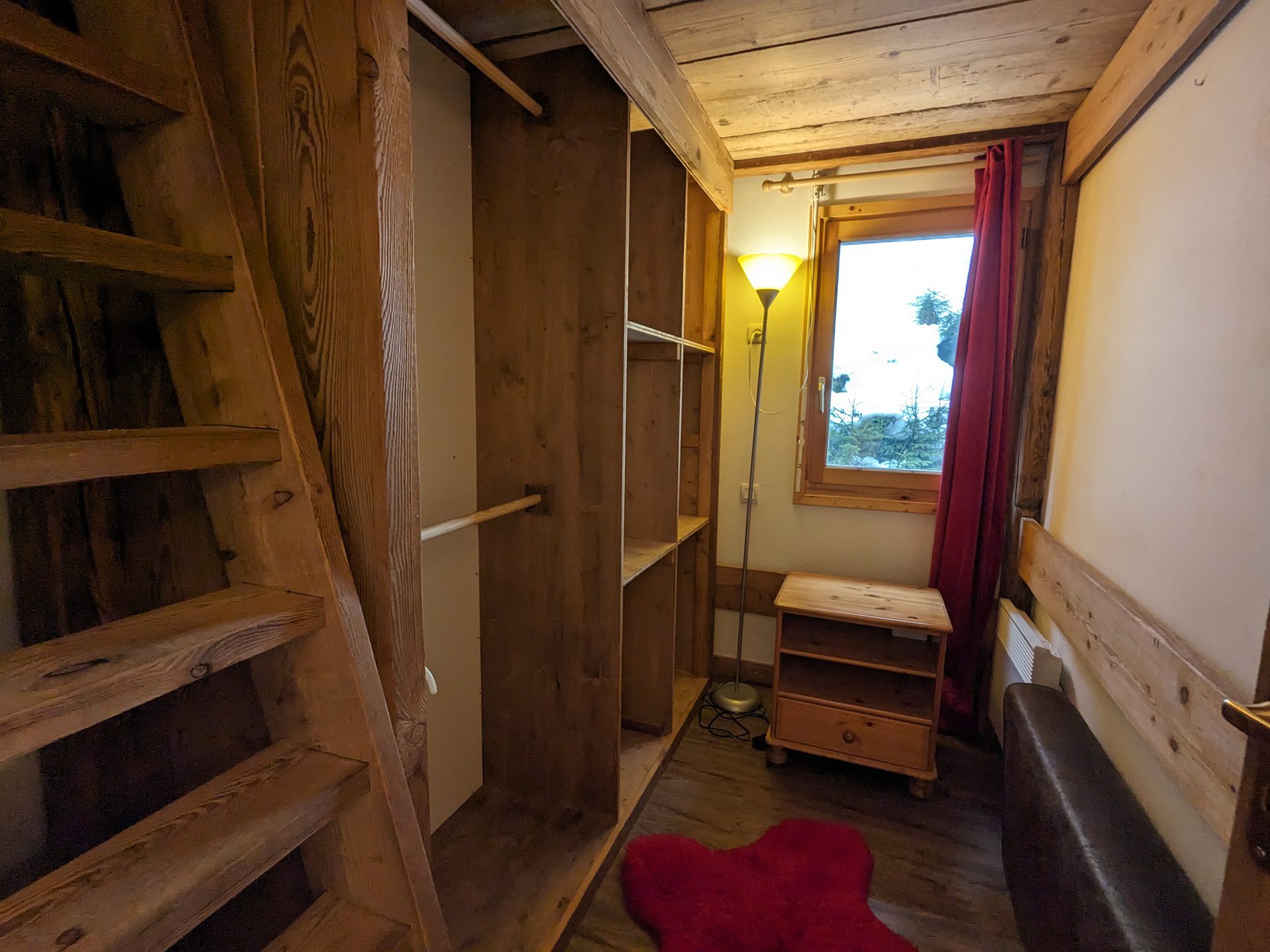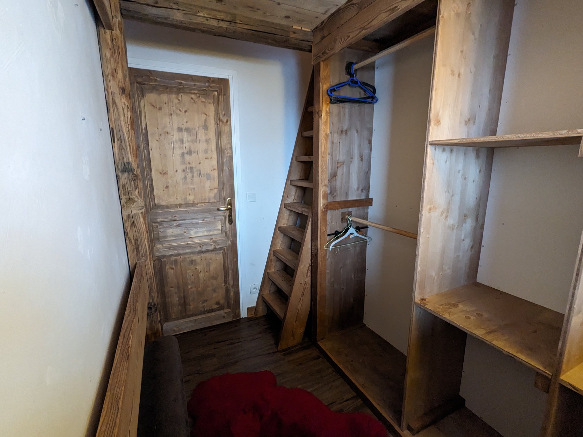 Entree/Hall - Coin Cabine : 1 Dressing, une mezzanine de couchage avec fenetre ouest, vue foret - Salle de bains (2.80m2) : Baignoire, lavabo - WC - Chambre 1 (avec Salle d'eau en partie mansardee) : Canape, armoire, fenetre ouest, vue foret, cabine douche, lavabo, wc, lave-linge, placard - Chambre 2 : 1 lit, placard, velux - Sejour en partie mansardee (23 m2) avec Coin salon : Canape d'angle, television, cheminee electrique, velux, porte fenetre vitree acces balcon - Coin repas : Table et chaises et banc - Cuisine equipee : 4 plaques vitroceramiques, evier, four, four micro-ondes, lave-vaisselle, hotte, refrigerateur (205L), cafetiere a filtre, grille-pain, bouilloire, appareil a raclette, placards
