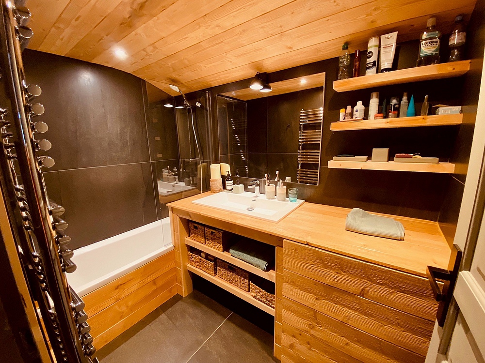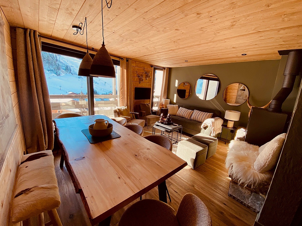 Entrée/Hall: placard-penderie et placard sèche-chaussures- Séjour avec coin salon : canapé, fauteuils, table basse, télévision, poêle à bois, Coin repas : Table et chaises, baie vitrée accès balcon sud, vue montagne et village - Coin cuisine équipée : plaques de cuisson, four, hotte, lave-vaisselle, réfrigérateur, évier, plan de travail, placards de rangement, bouilloire, grille-pain, machine à café Nespresso, appareil à raclette, appareil à crêpes - Escaliers accès étage : Chambre 1 (m²): 1 lit 160 cm, placard penderie, TV, fenêtre sud vue pistes et village - Salle de bains (m²) : Baignoire, lavabo, lave-linge - WC séparé - Chambre 2 (m²) : 1 lit 140 cm, placard penderie, fenêtre nord - Chambre 3 (m²) : 2 lits 90cm 1 personne avec possibilité de lit double pour 2 personnes, placard penderie, fenêtre nord.