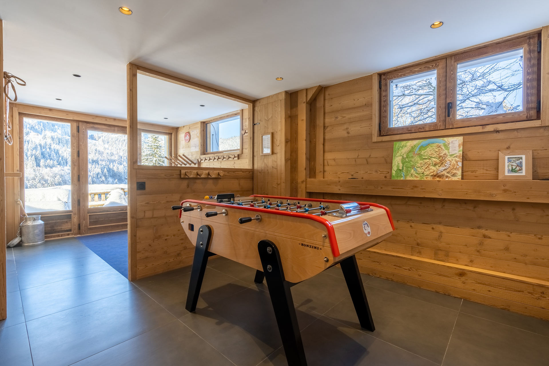 Au RDC : ski-room avec seche-chaussures/seche-gants et rangement casques, une salle de baby-foot, grand sauna et douche, chambre avec 2 lits 80cm pouvant se rapprocheret sa salle d'eau privative (douche, vasque, wc), buanderie avec lave-linge et seche-linge.