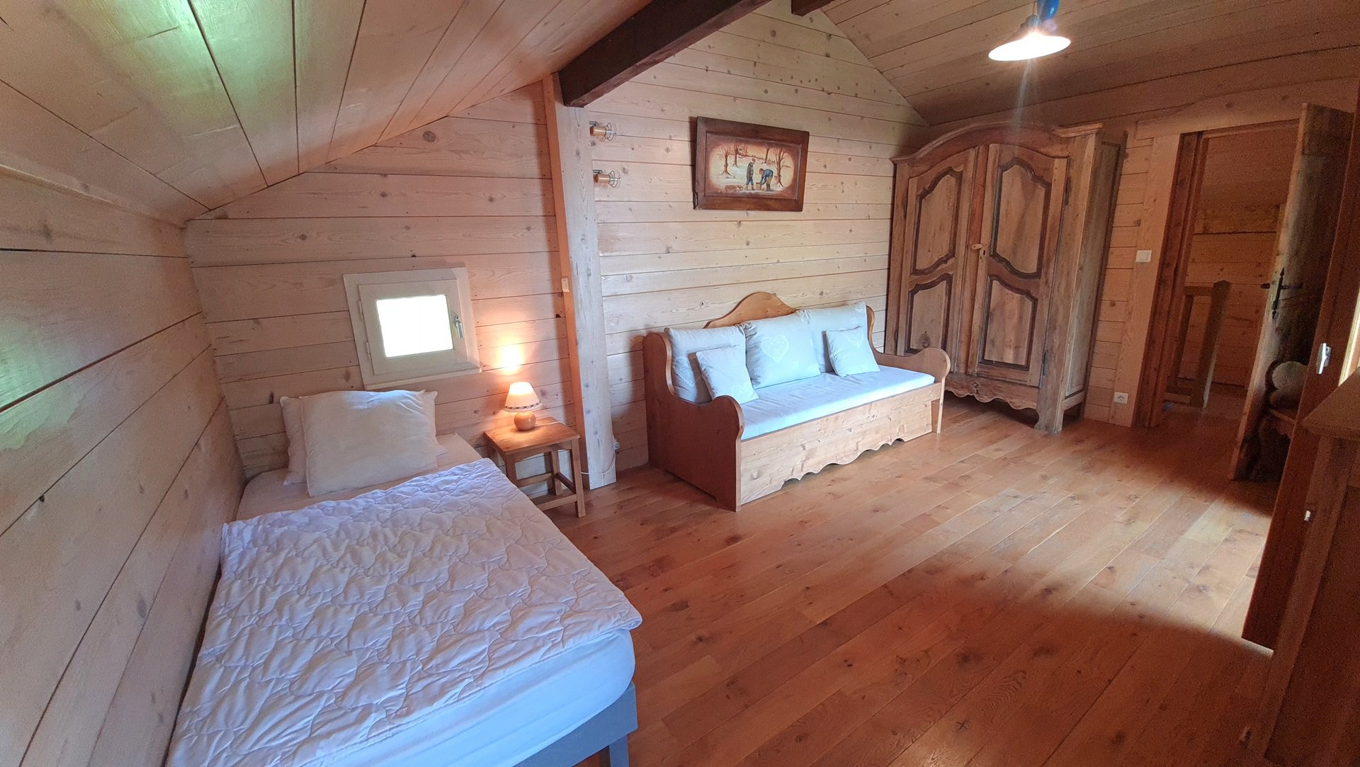 Chalet authentique 4 chambres mezzanine pour 8 personnes 110m2, secteur Riffroids, avec terrasse et balcon. Orientation Est, vue sur la chaine des Aravis.