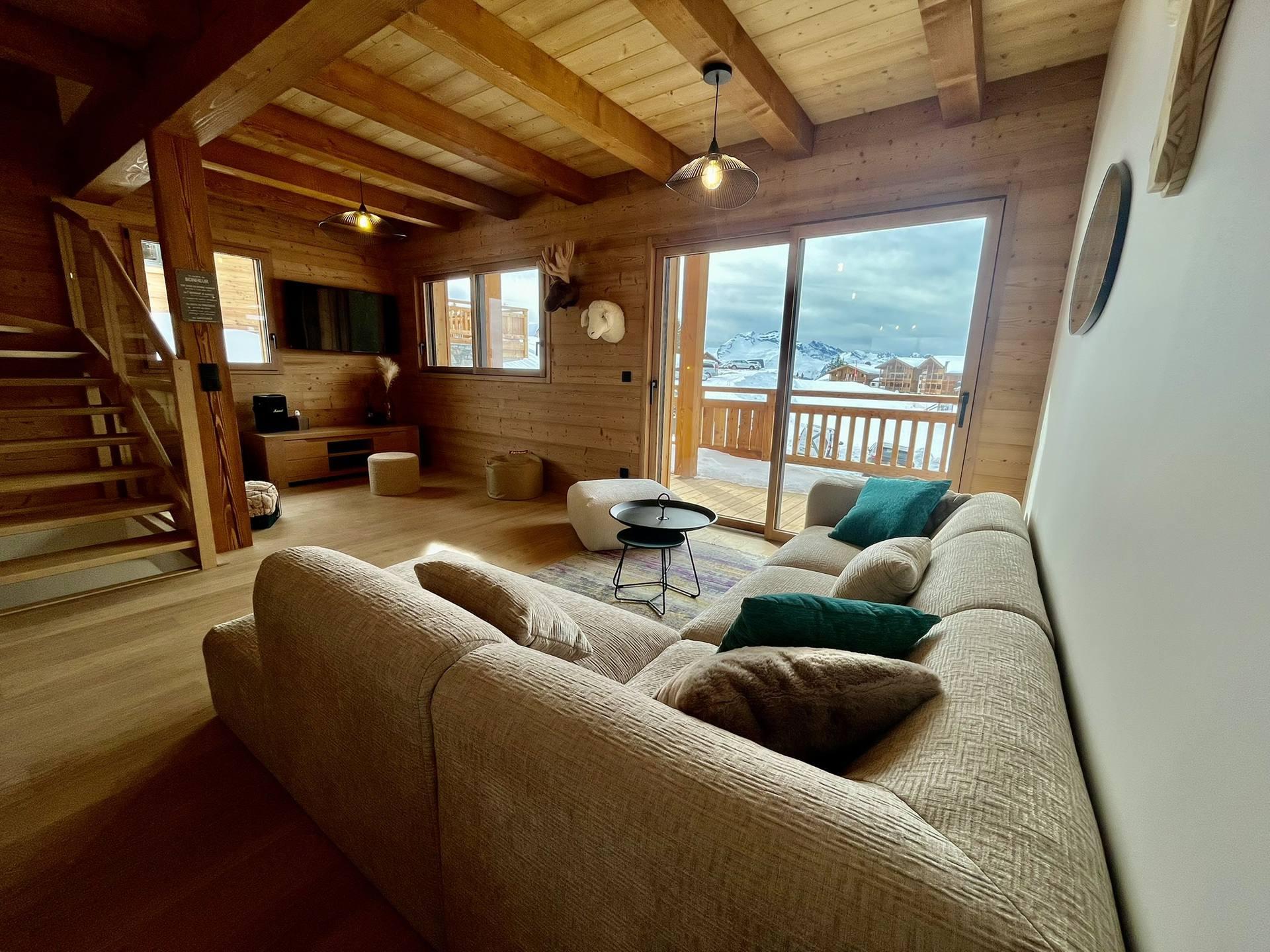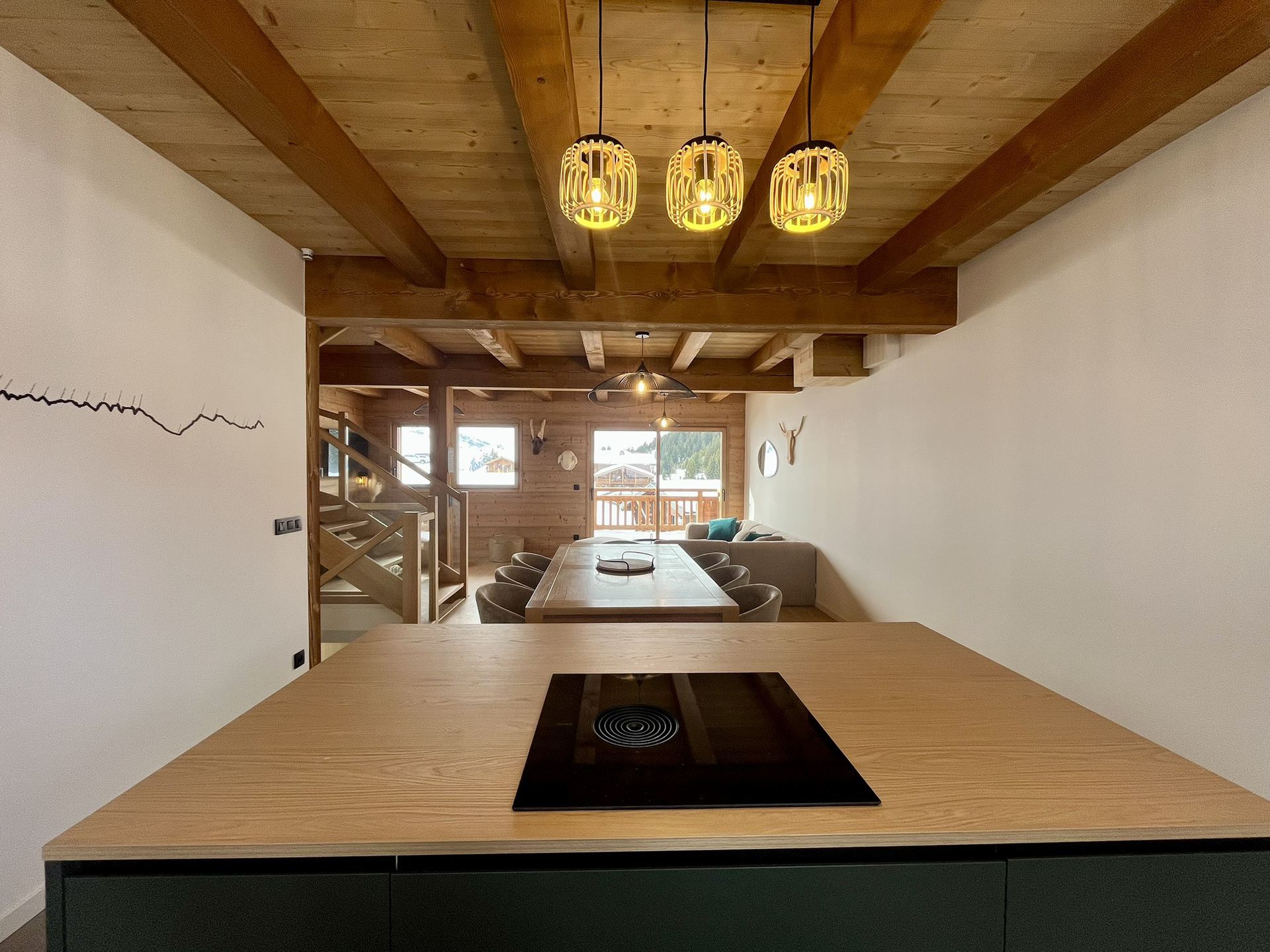 Au RDC : grand sejour (30.79 m2) tres lumineux avec table 8 personnes, vue sur massif de Beauregard, salon, TV, canape et fauteuils, cuisine equipee ouverte sur sejour (10.37 m2) : refrigerateur, four, micro-onde, plaques de cuisson a induction, hotte, lave-vaisselle, bouilloire, cafetiere Nespresso, grille-pain, appareil a raclette et fondue - Cellier (2.16 m2): lave-linge - WC separe - Terrasse (30.12m2) accessible depuis le sejour.
