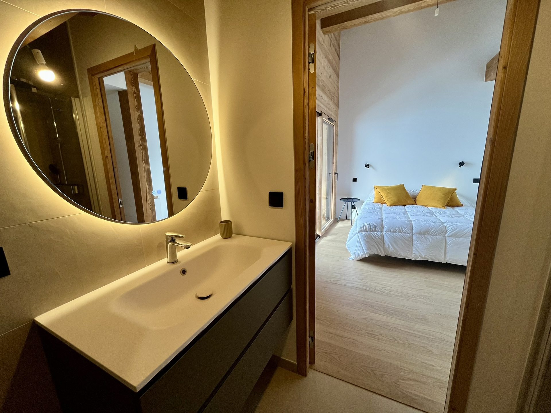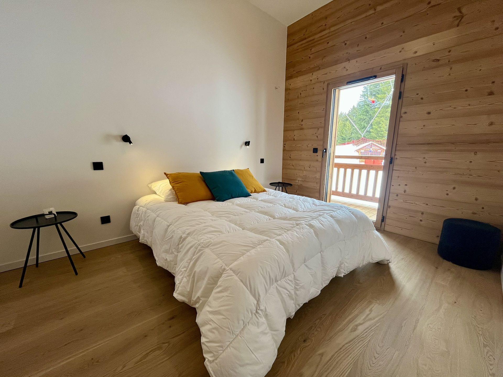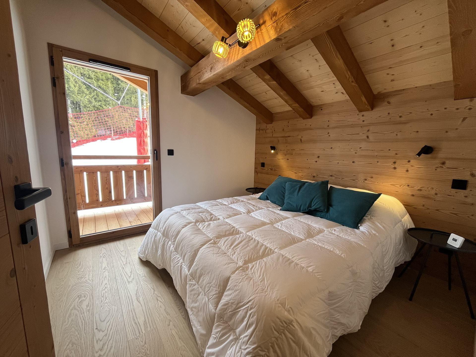Demi-chalet de 104.33m2 sur 3 niveaux, livre en decembre 2024. Pour 6 personnes - 3 chambres +1 garage et 1 place de parking privative - Orientation Ouest - Terrasse et balcons.