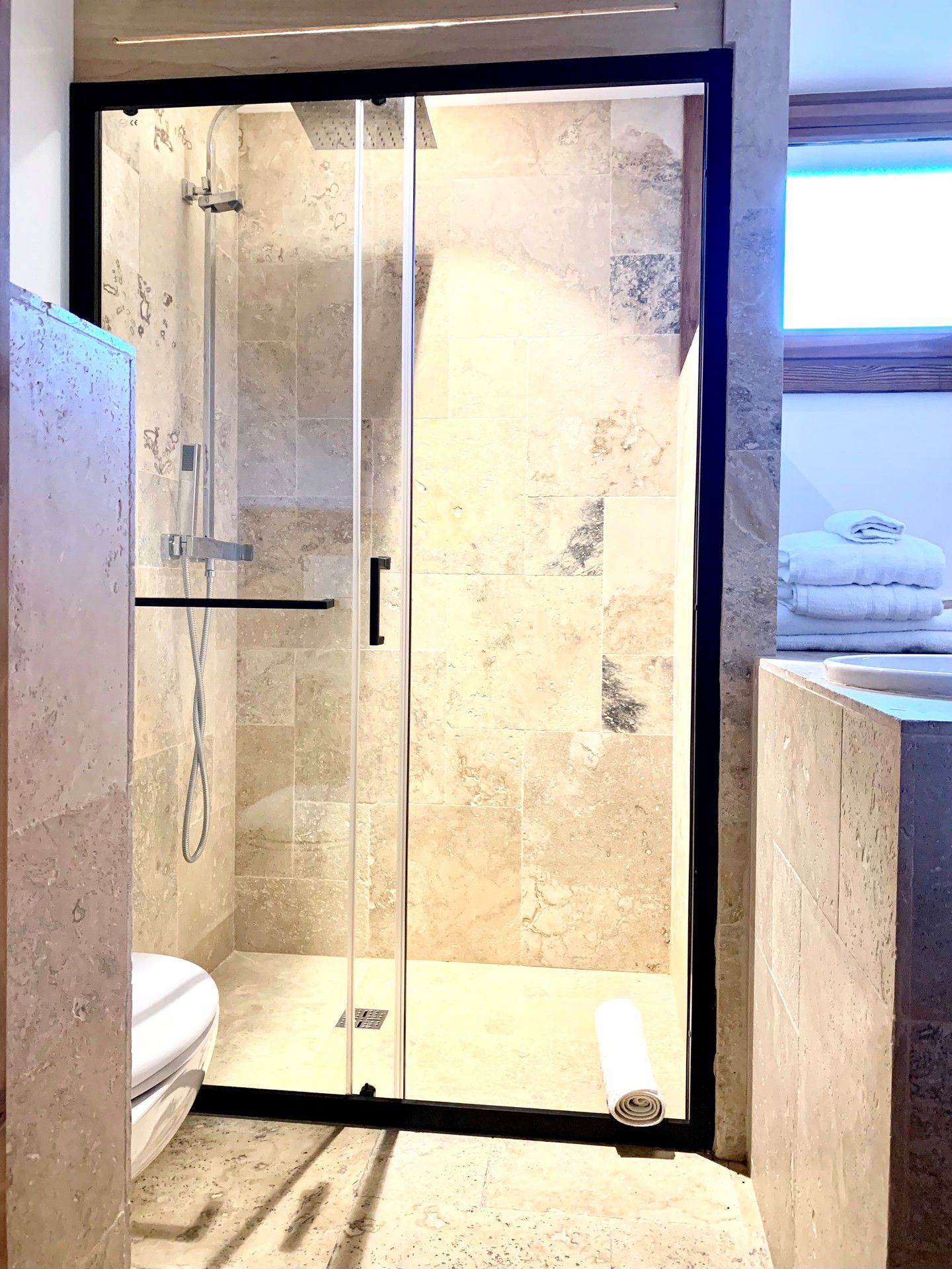 > une chambre en suite avec un lit de 140 avec une douche à l'italienne avec toilettes