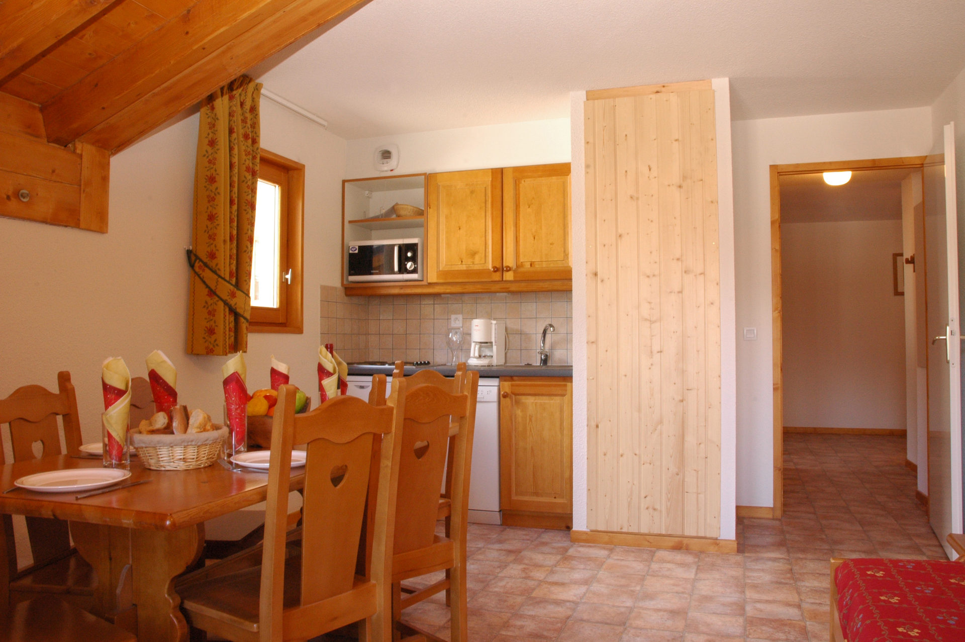 Sejour avec kitchenette equipee : micro-onde/grill, refrigerateur, 4 plaques electriques, lave vaisselle, bouilloire, cafetiere, television.
