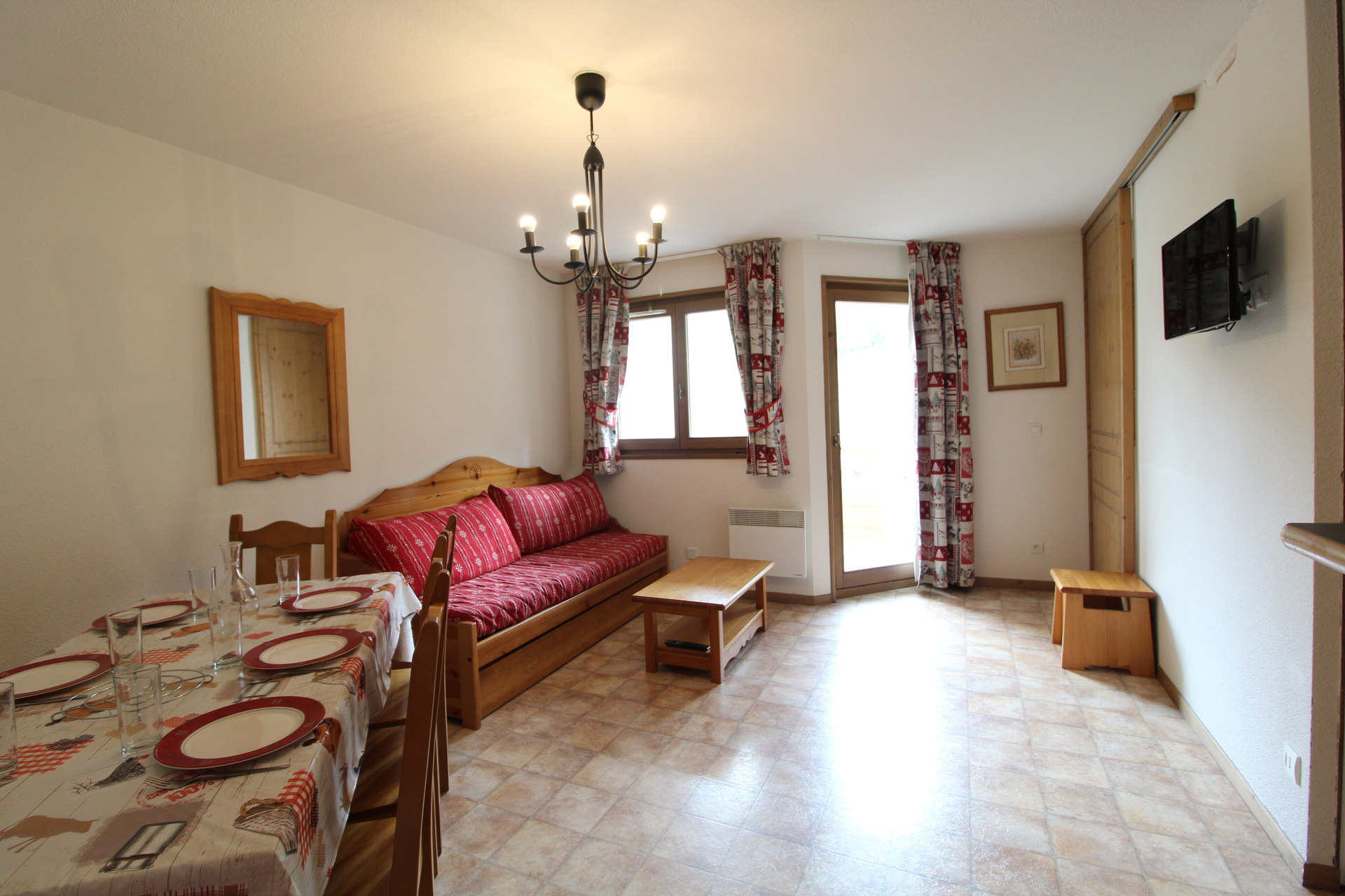 Sejour avec kitchenette equipee : micro-onde/grill, refrigerateur, 4 plaques electriques, lave vaisselle, cafetiere electrique, television.