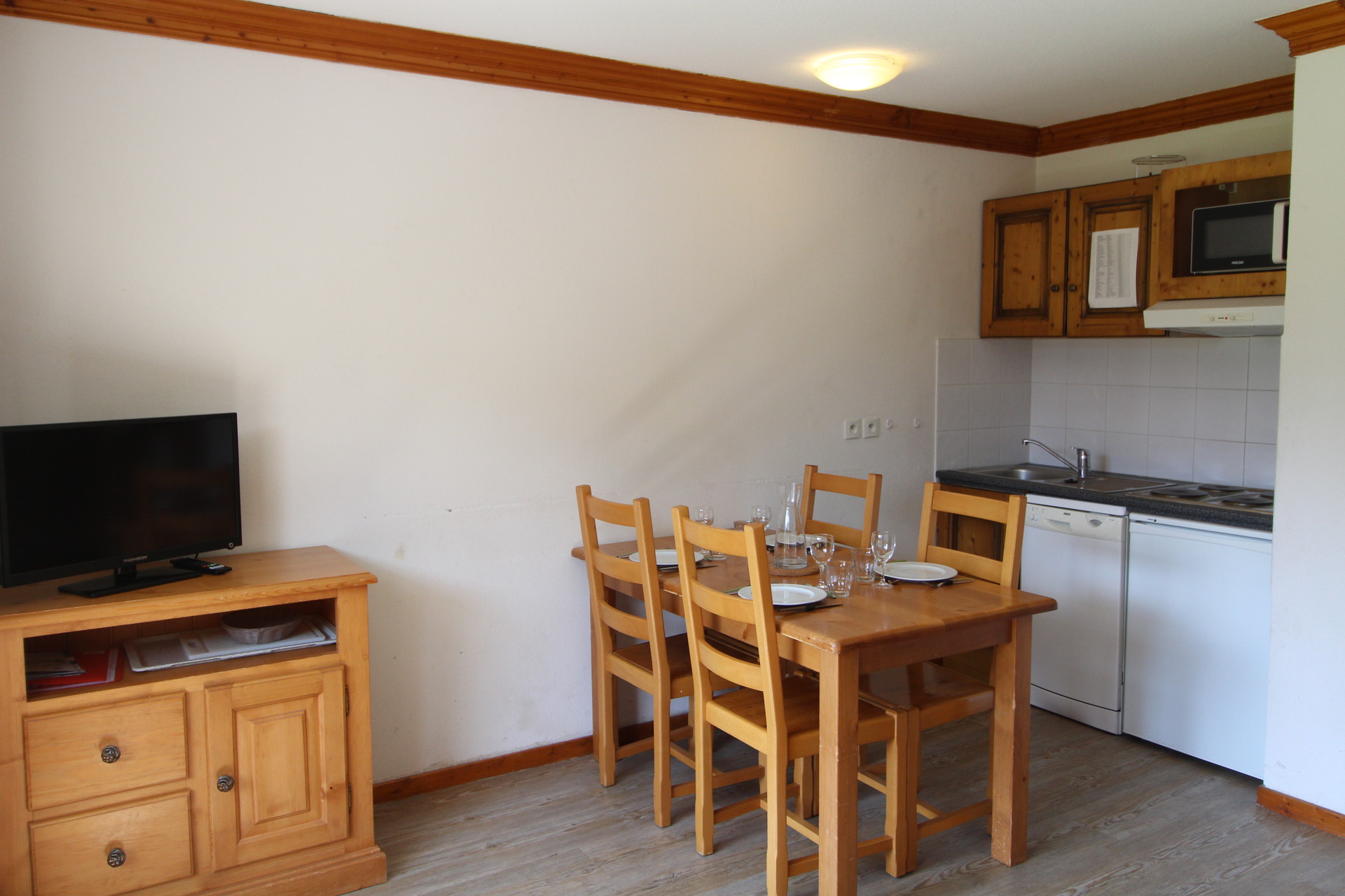 Sejour avec kitchenette equipee : micro-onde/grill, refrigerateur, 4 plaques electriques, lave vaisselle, hotte aspirante.