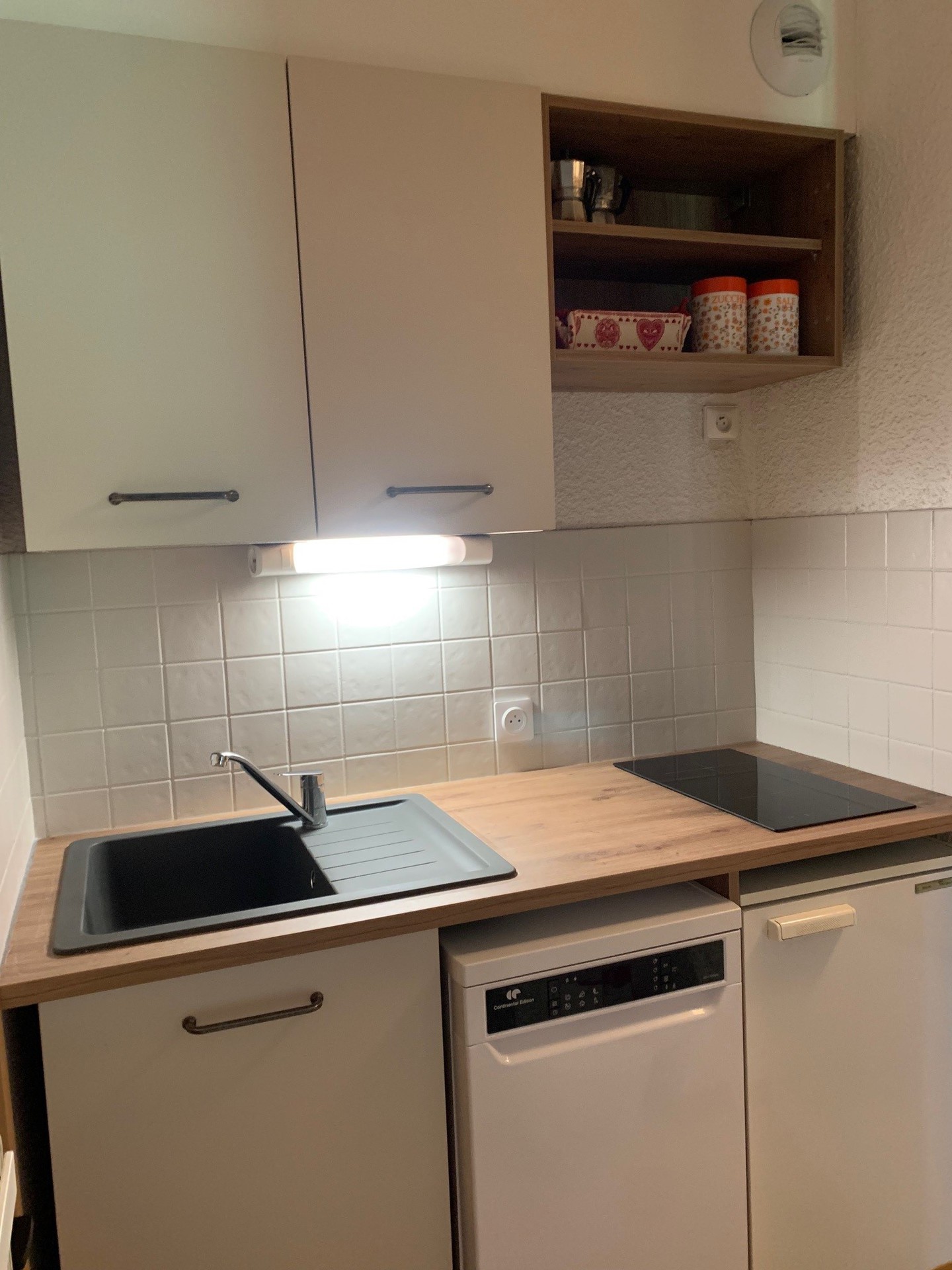 Cuisinette equipee : four, refrigerateur, 2 plaques vitroceramiques, lave vaisselle.