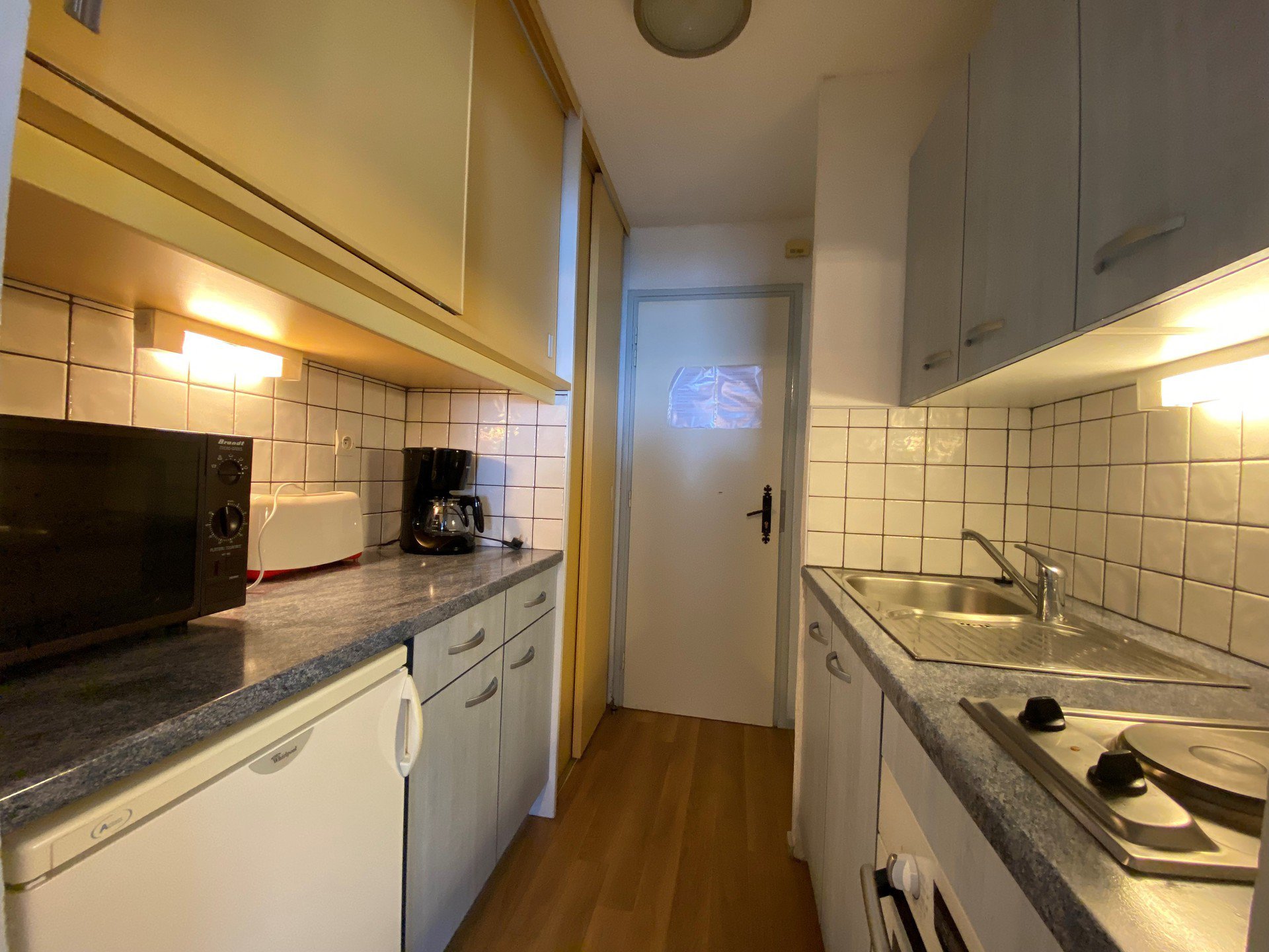 Kitchenette équipée : 2 plaques électriques, four, réfrigérateur, micro-ondes.