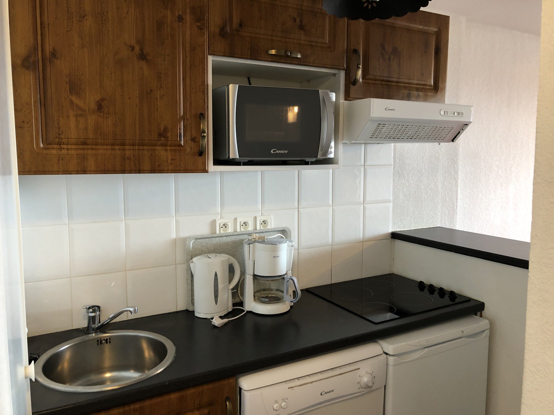 Coin cuisine equipee d'une plaque vitroceramique, four micro ondes, lave-vaisselle et refrigerateur ( appareil a raclette)