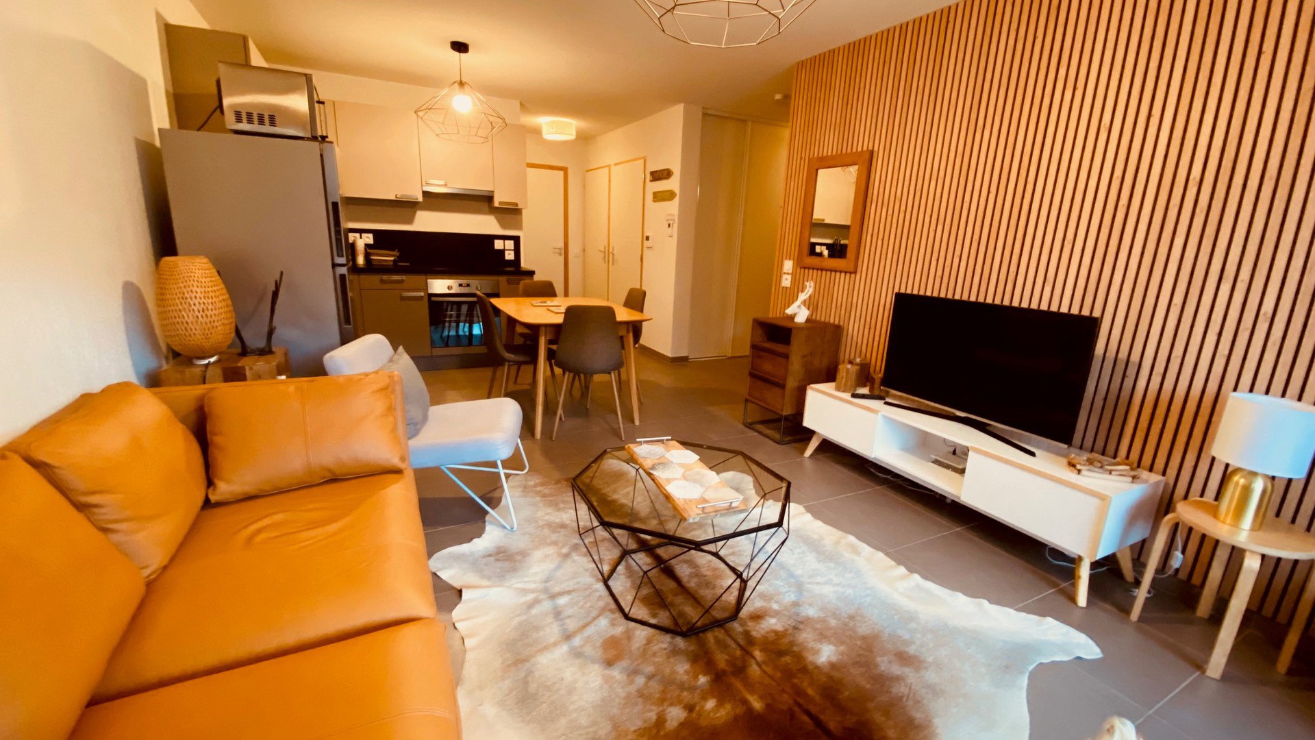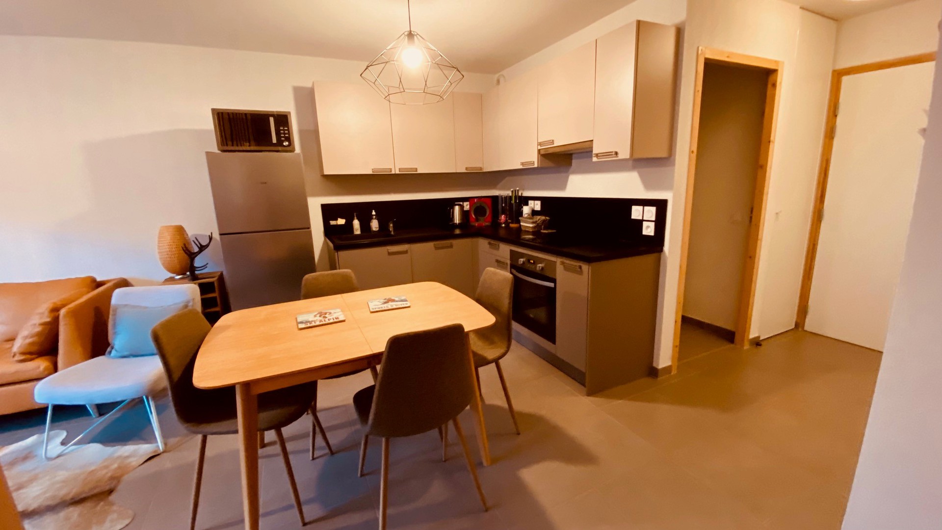 Entree avec petite buanderie (3m2) : Lave-linge, seche-linge, etageres - WC - Salle d'eau (5.83m2) : Douche, lavabo, seche-serviette - Cabine/Coin nuit (7m2) : Placard, lits - Chambre : (12.60m2) : Lit, penderie et baie acces balcon sud - Sejour (21.37m2) : Cuisine equipee : Lave-vaisselle, four, refrigerateur, plaques induction, machine a cafe DolceGusto, nombreux placards - Coin repas et coin salon avec TV et baie acces balcon sud.