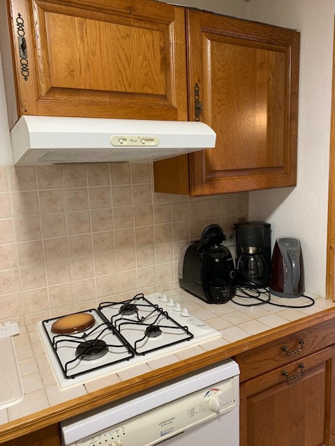 Cuisine ouverte : four, micro-ondes, lave-vaisselle, refrigerateur (122L) /congelateur (40L), 3 feux gaz+1 plaque electrique.