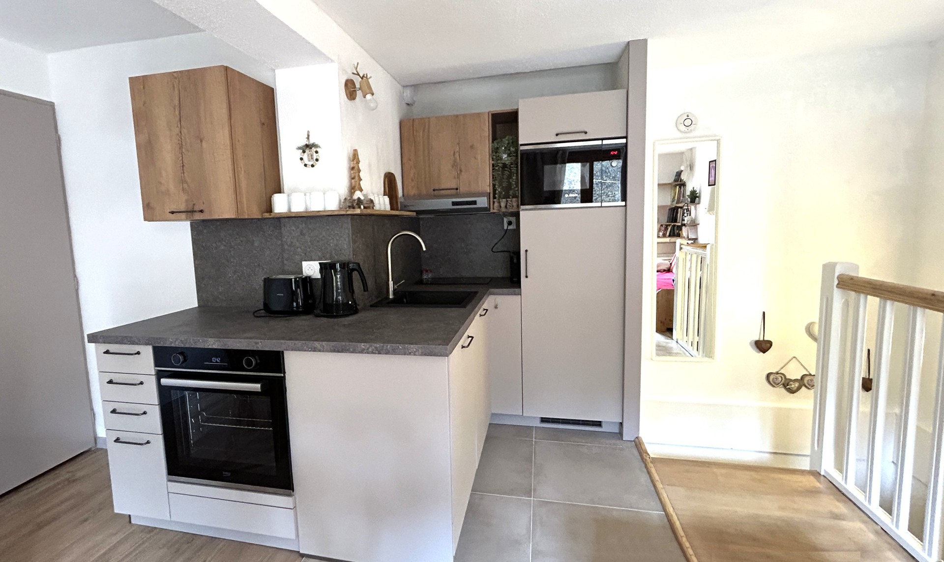 - Coin cuisine : four, micro-ondes, 2 plaques vitroceramiques, lave-vaisselle, refrigerateur/congelateur