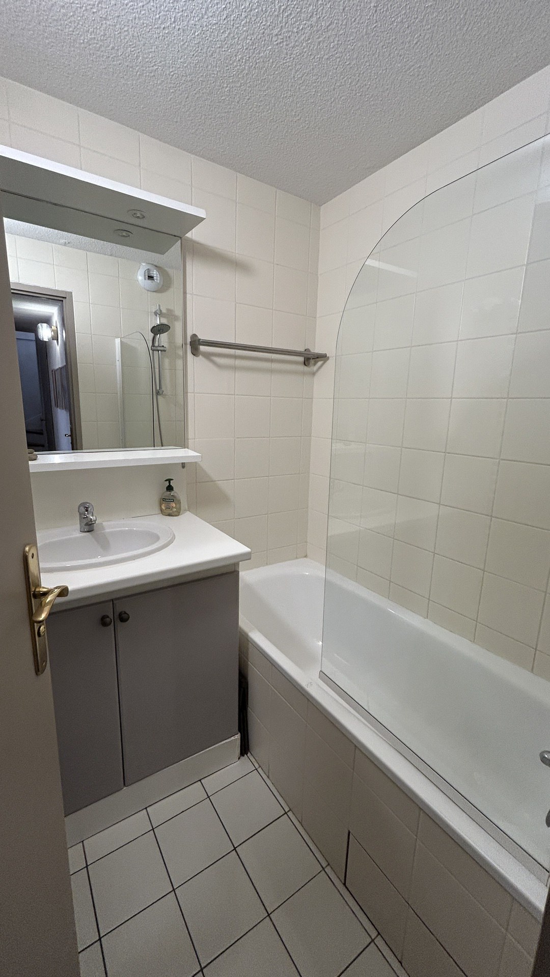 Salle de bains (Niv -1) : lavabo, baignoire, seche-cheveux.