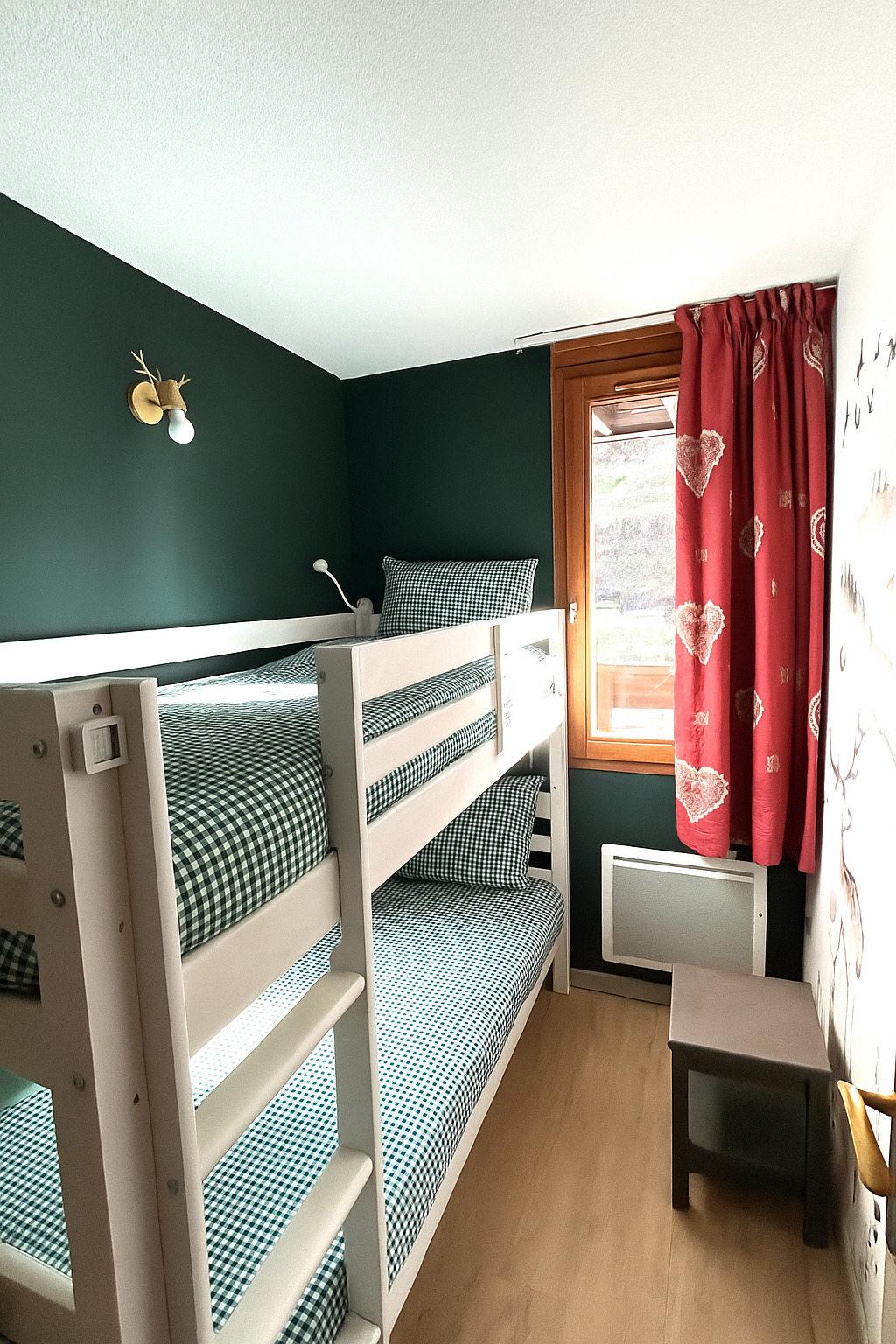Chambre 2 (Niv -1/ 9,5m2/ Est) : 1 lit double (140cm) + 1 lit simple superpose (90cm)