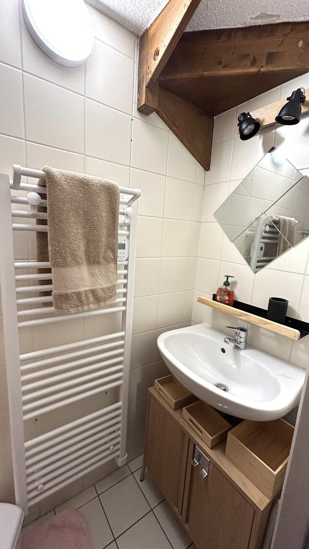 Salle d'eau (Niv -1) : lavabo, douche, seche-cheveux.