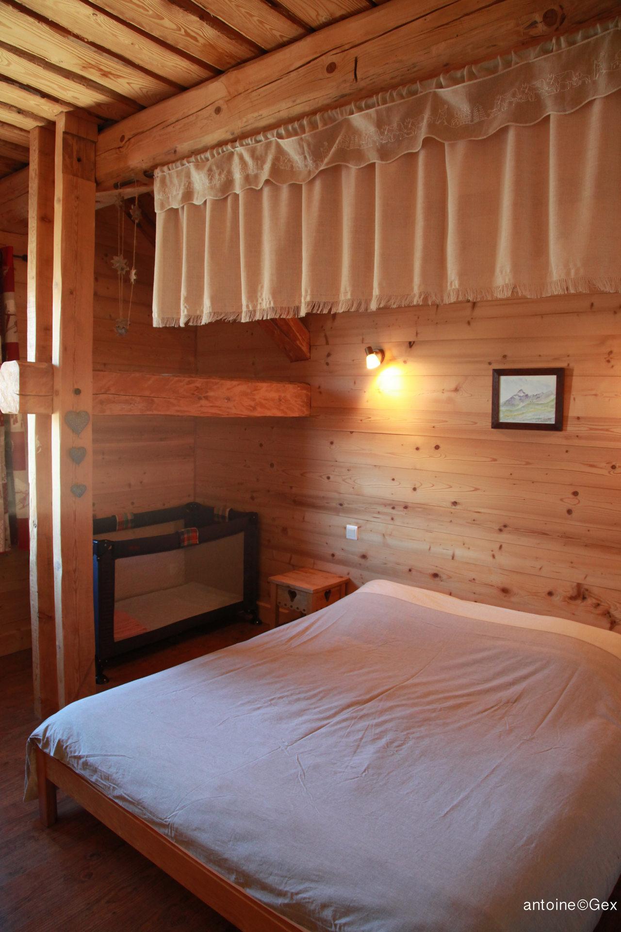 Chambre 1 (Niv +1/ 14m2/ Sud-Est) : 1 lit double (160x190cm) + 1 lit bebe, avec douche et lavabo