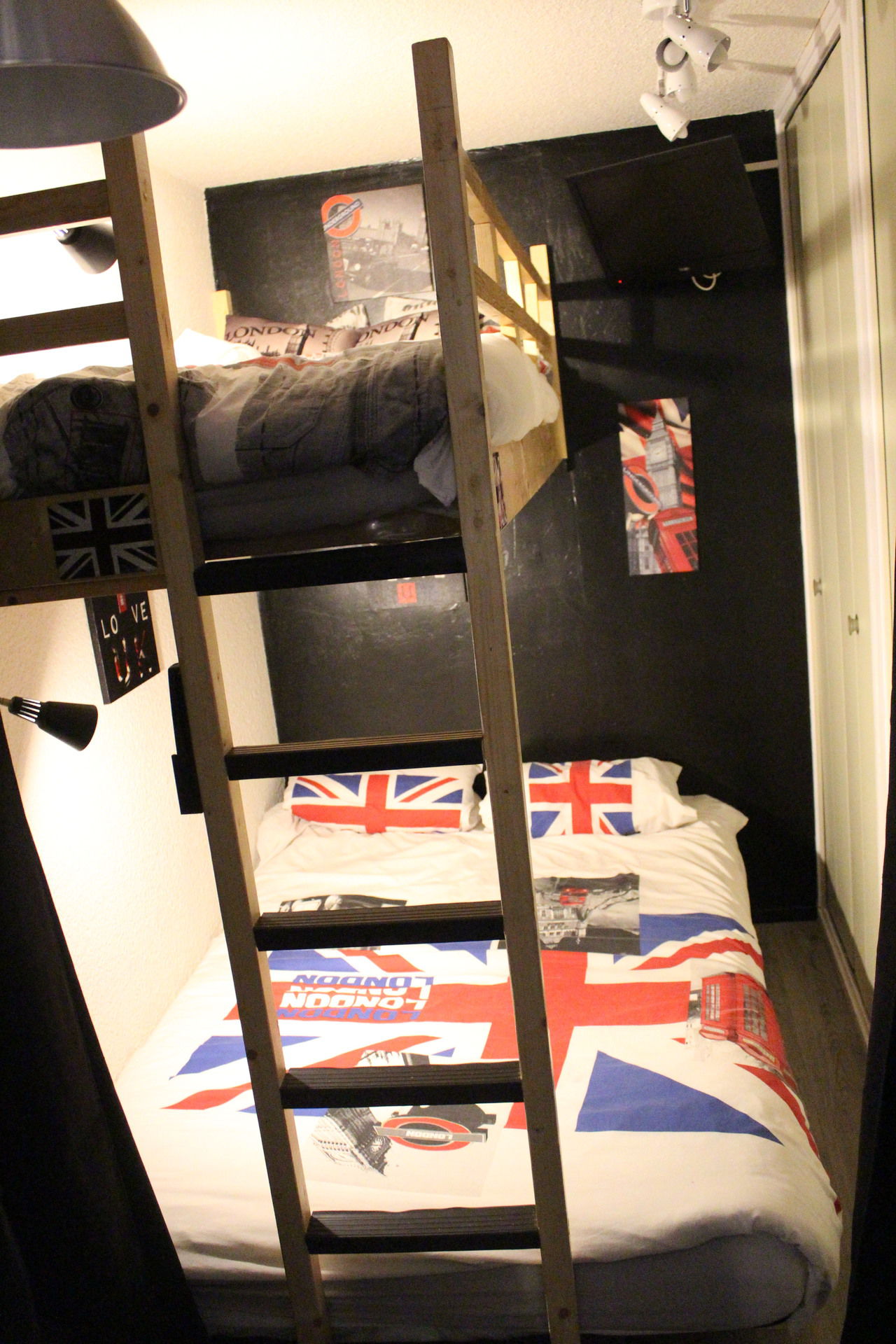 Cabine (separee de l'entree par un rideau/ 6m2) : 1 canape clic-clac (140cm) + 1 lit simple superpose.