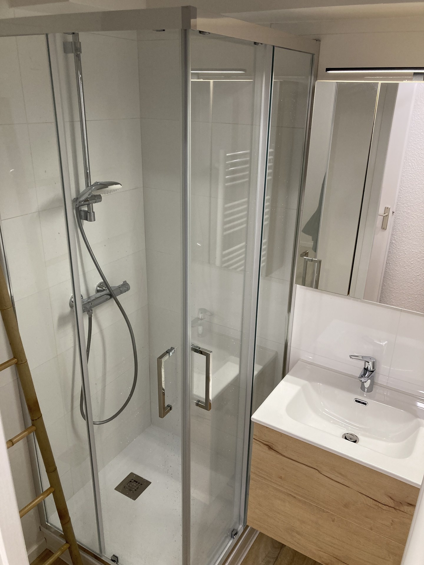 Salle de d'eau : lavabo, douche et seche-cheveux. WC independant.