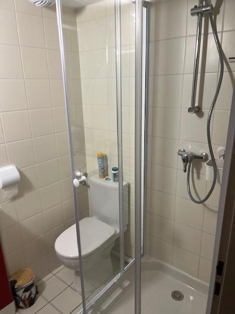 Salle de bains : lavabo, douche, seche-cheveux et WC incorpore