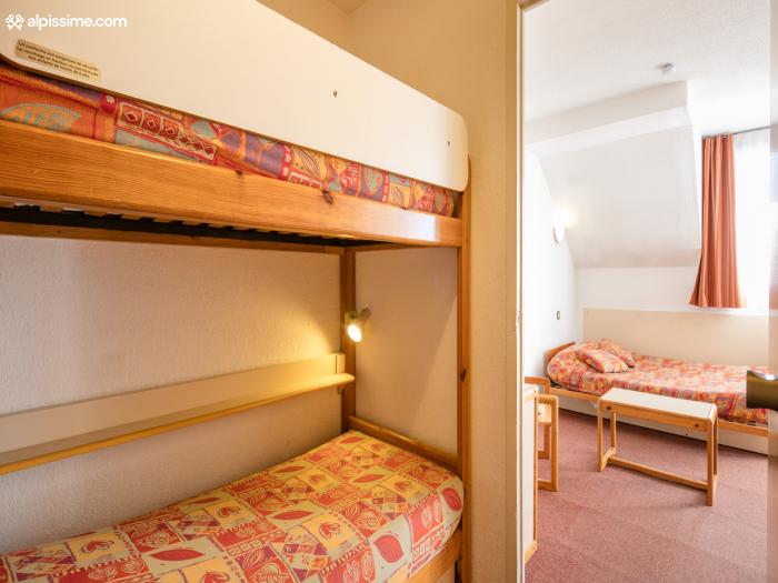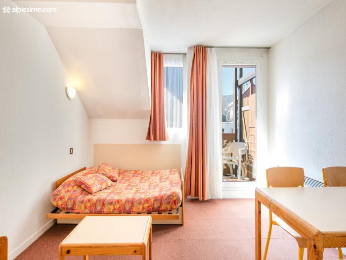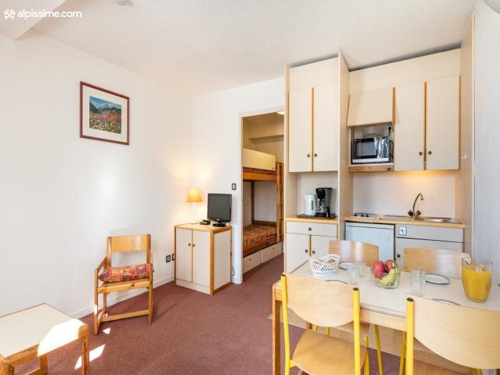 Ce studio pour 4 personnes d'une surface de 24m² se compose d'une entrée avec lit superposé et placard, d'un séjour avec 1 canapé-convertible double et TV et d'un coin cuisine équipée. Salle de bain avec WC, balcon.