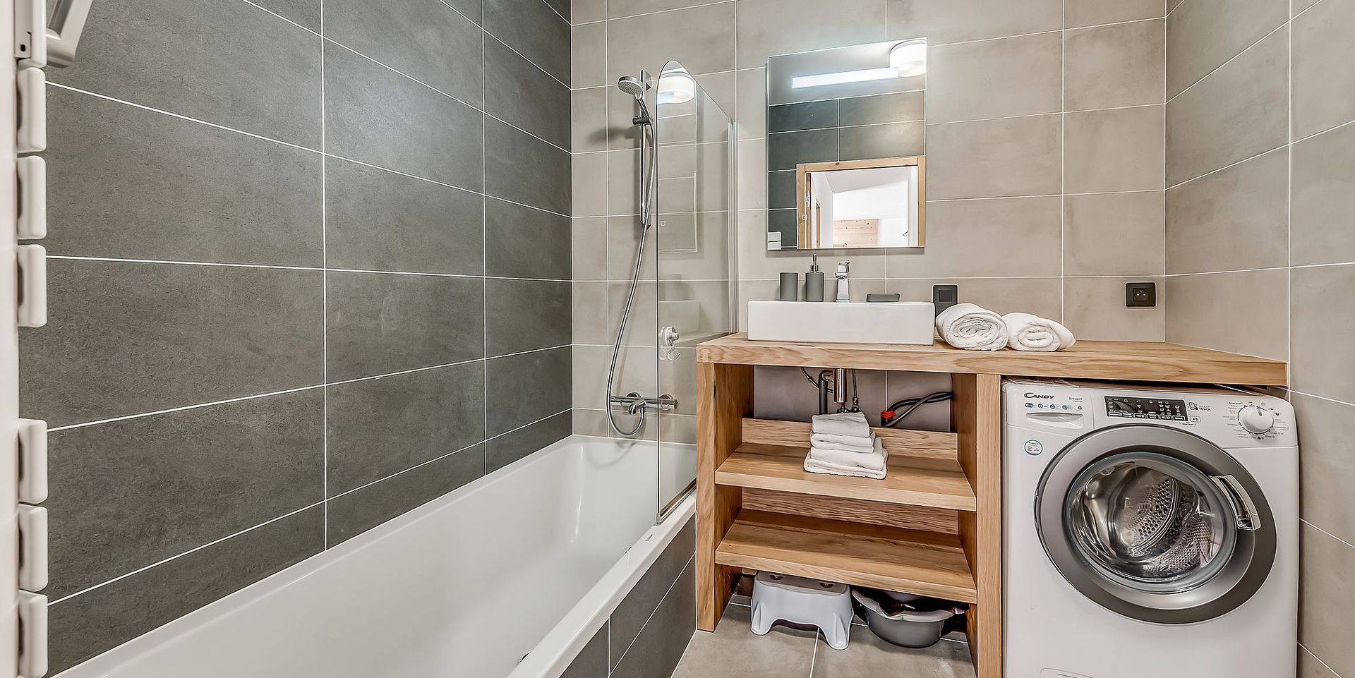 - 1 salle de bains avec lave-linge/seche-linge, radiateur seche-serviettes