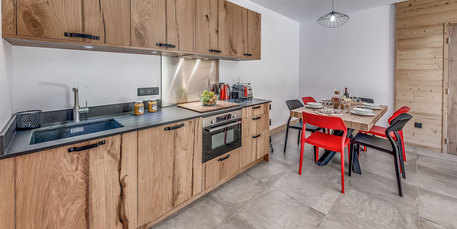 * cuisine toute equipee : four multifonctions, plaques induction, refrigerateur et partie congelateur, lave-vaisselle, vaisselle complete