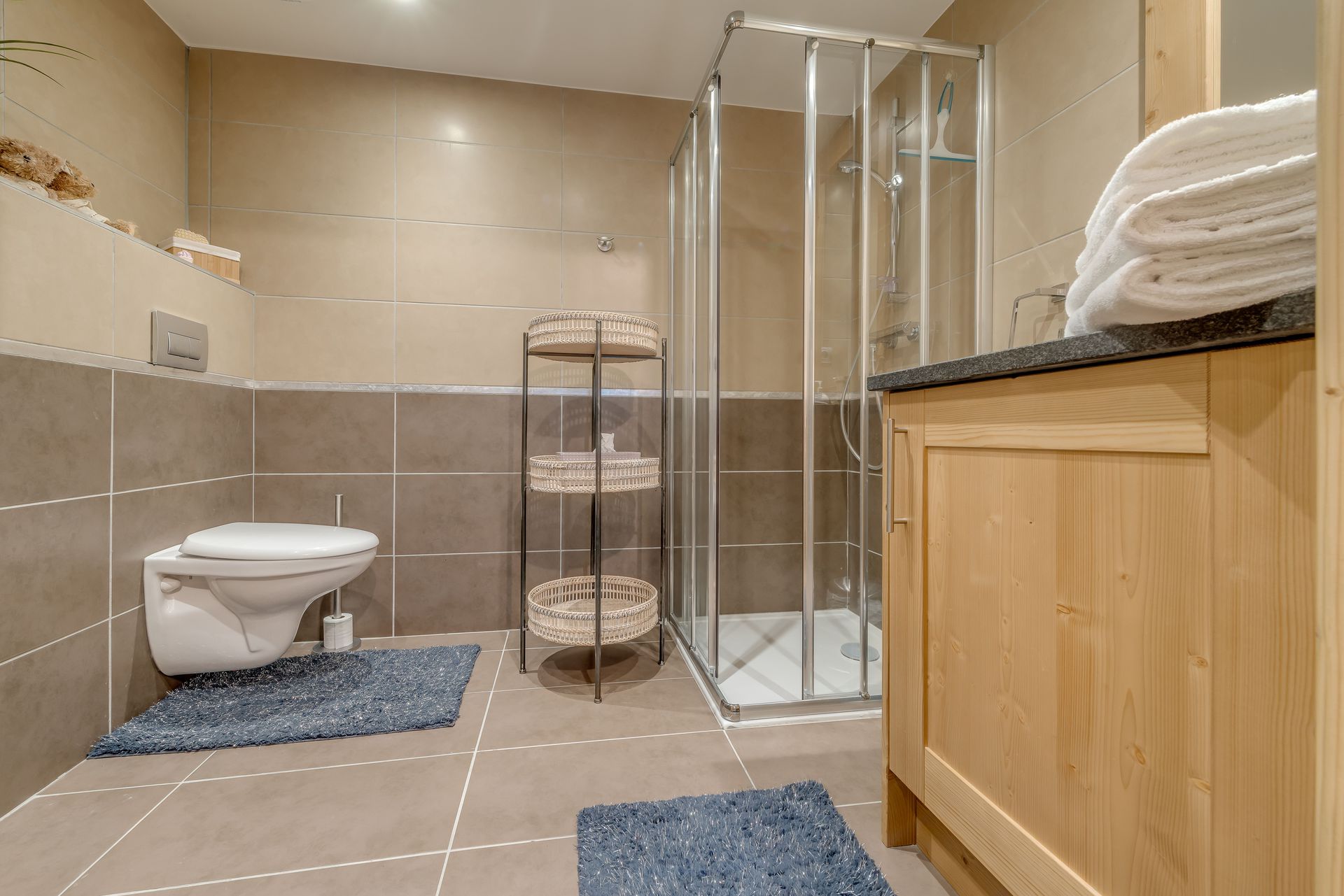 * Salle de bains avec toilettes : douche, meuble vasque, sèche serviette, sèche cheveux, WC