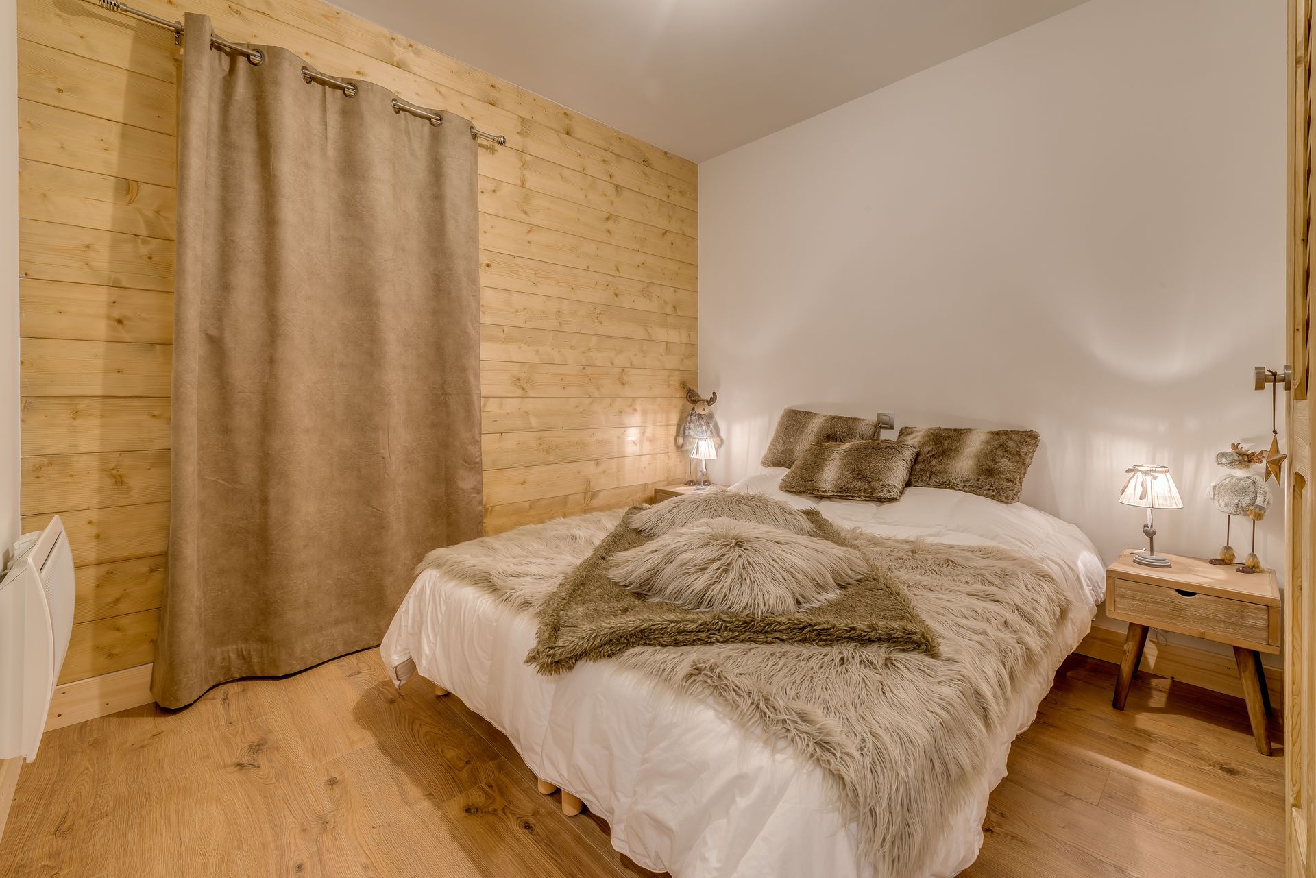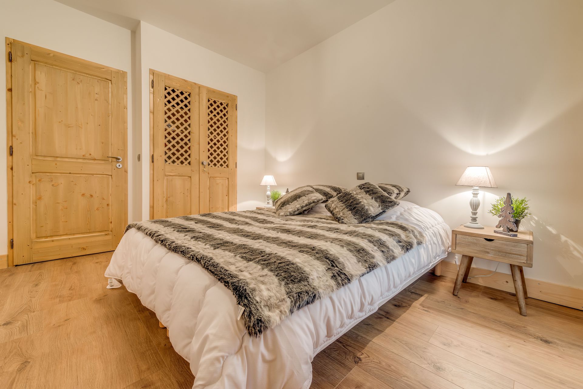 * Chambre 2 : 1 lit double (160x200), chevets, lampes de chevet, placard avec étagère et penderie