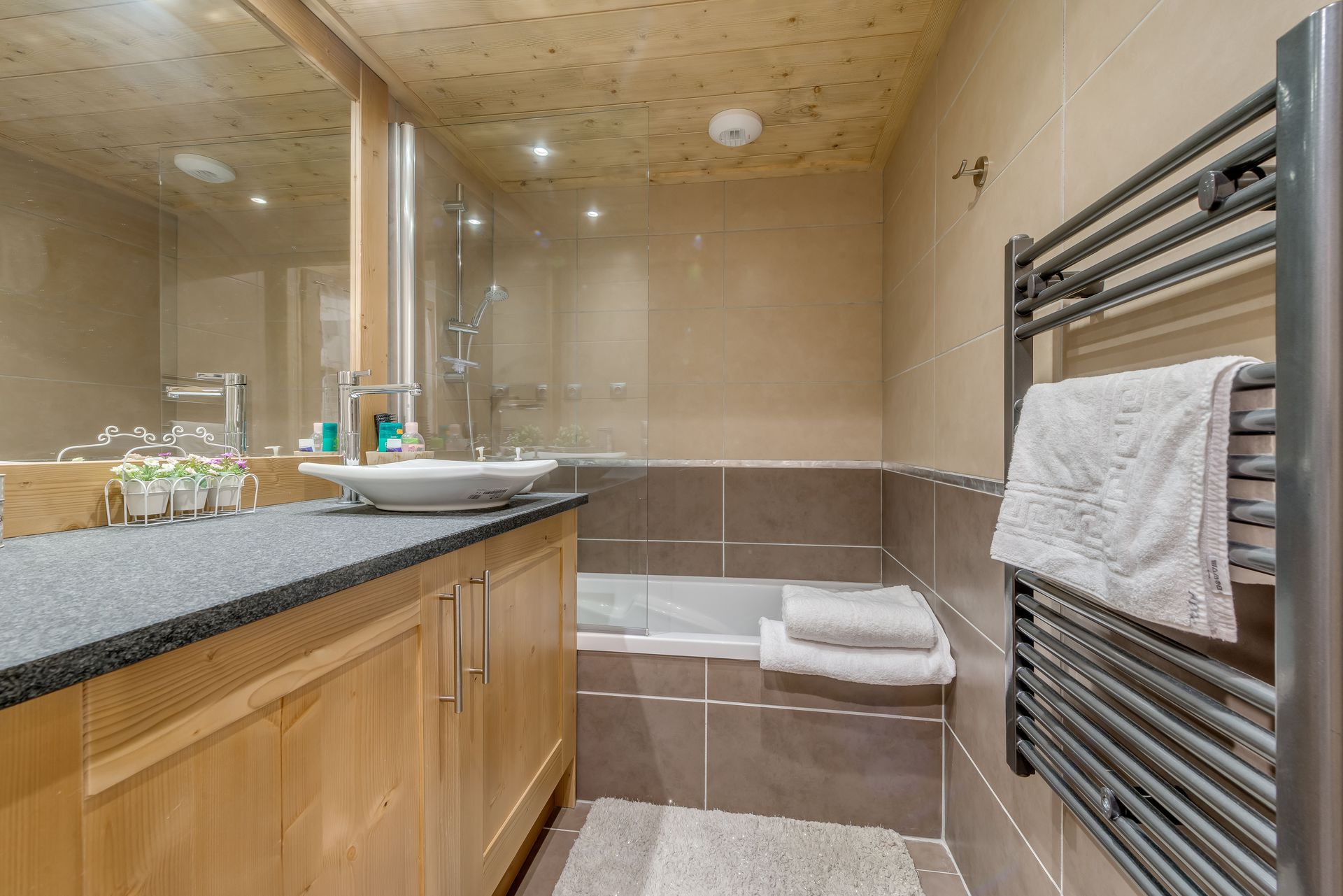 * Salle de Bains: baignoire, meuble vasque, sèche serviette, lave linge séchant