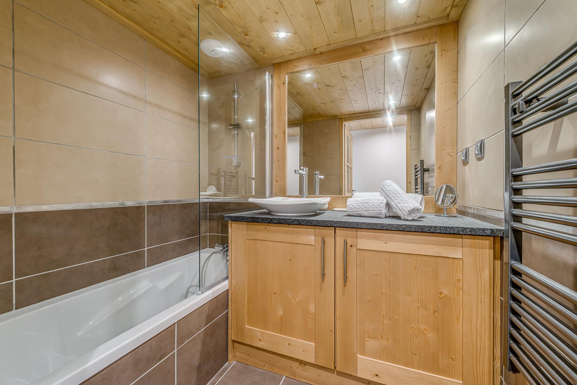 - Salle de bains : baignoire, meuble vasque, sèche serviette, sèche cheveux