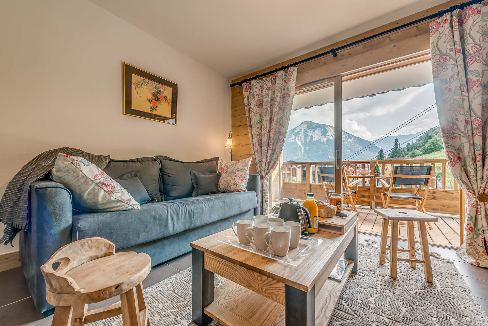 - Séjour : coin repas avec une table, 6 chaises, un canapé lit (couchage 160x200), table basse, meuble TV, écran plat, lecteur DVD, grande baie vitrée donnant sur un balcon aménagé, accès balcon