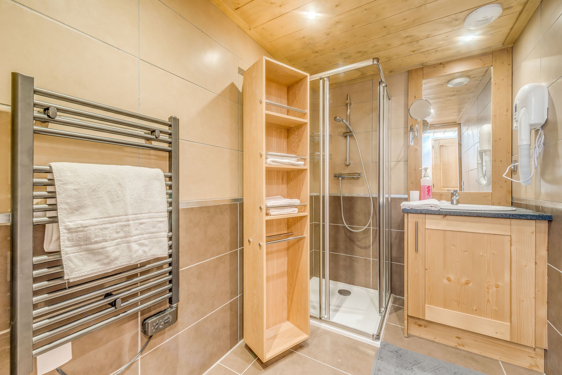 * Salle de bains : douche, meuble vasque, seche serviette, seche cheveux
