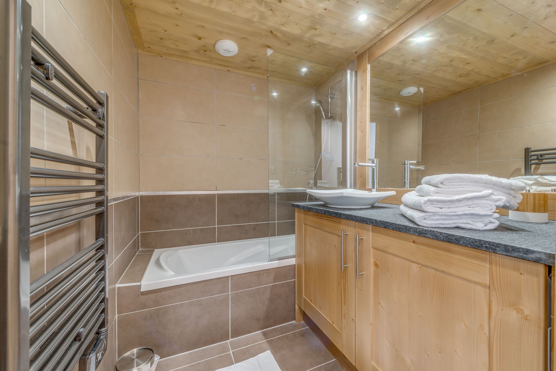 - Salle de bains : baignoire, meuble vasque, seche serviette, seche cheveux, machine a laver sechante