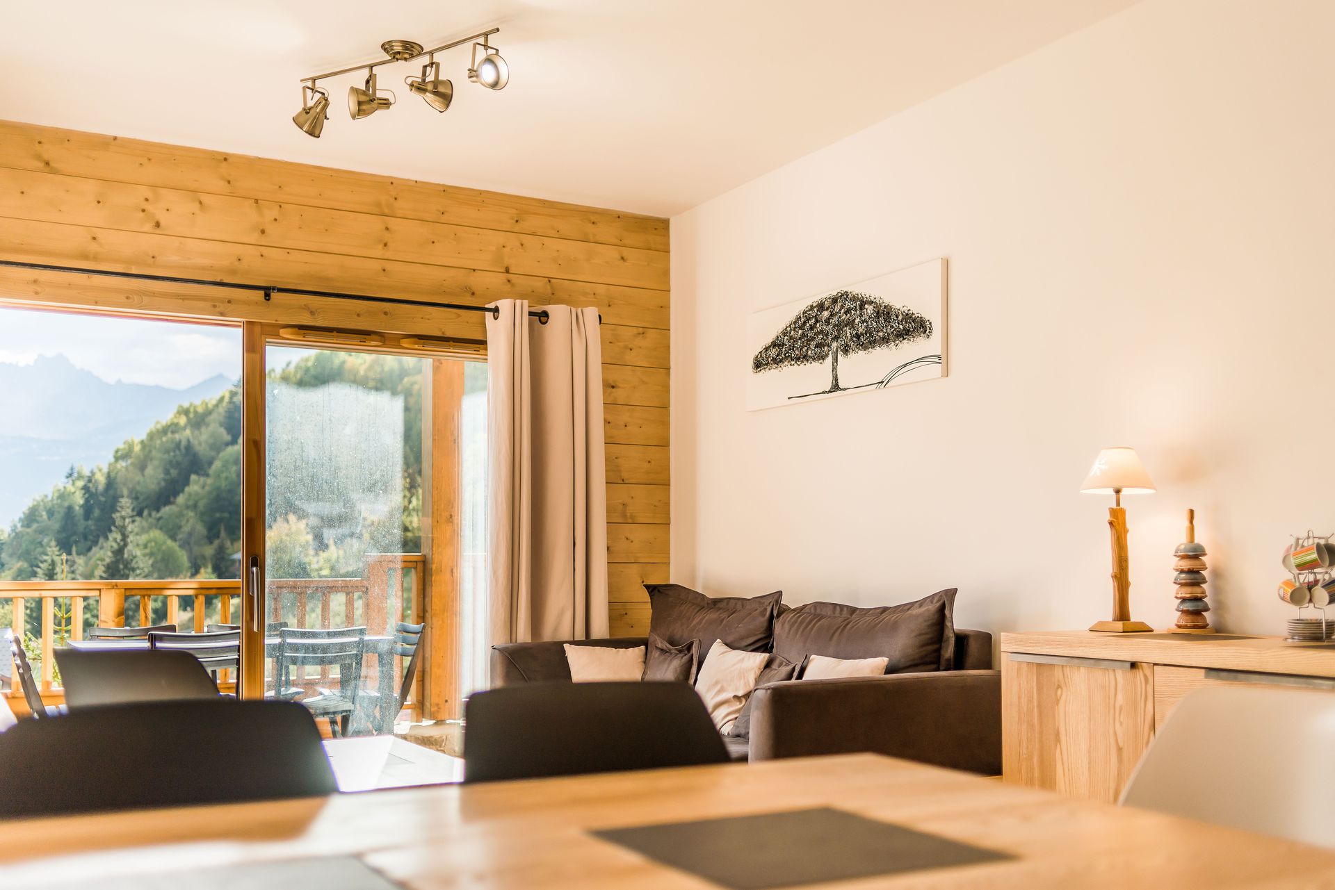 - Sejour : coin repas avec une table, 6 chaises, un canape lit (couchage 160x200), table basse, meuble TV, ecran plat, lecteur DVD, grande baie vitree donnant sur un balcon amenage, acces balcon