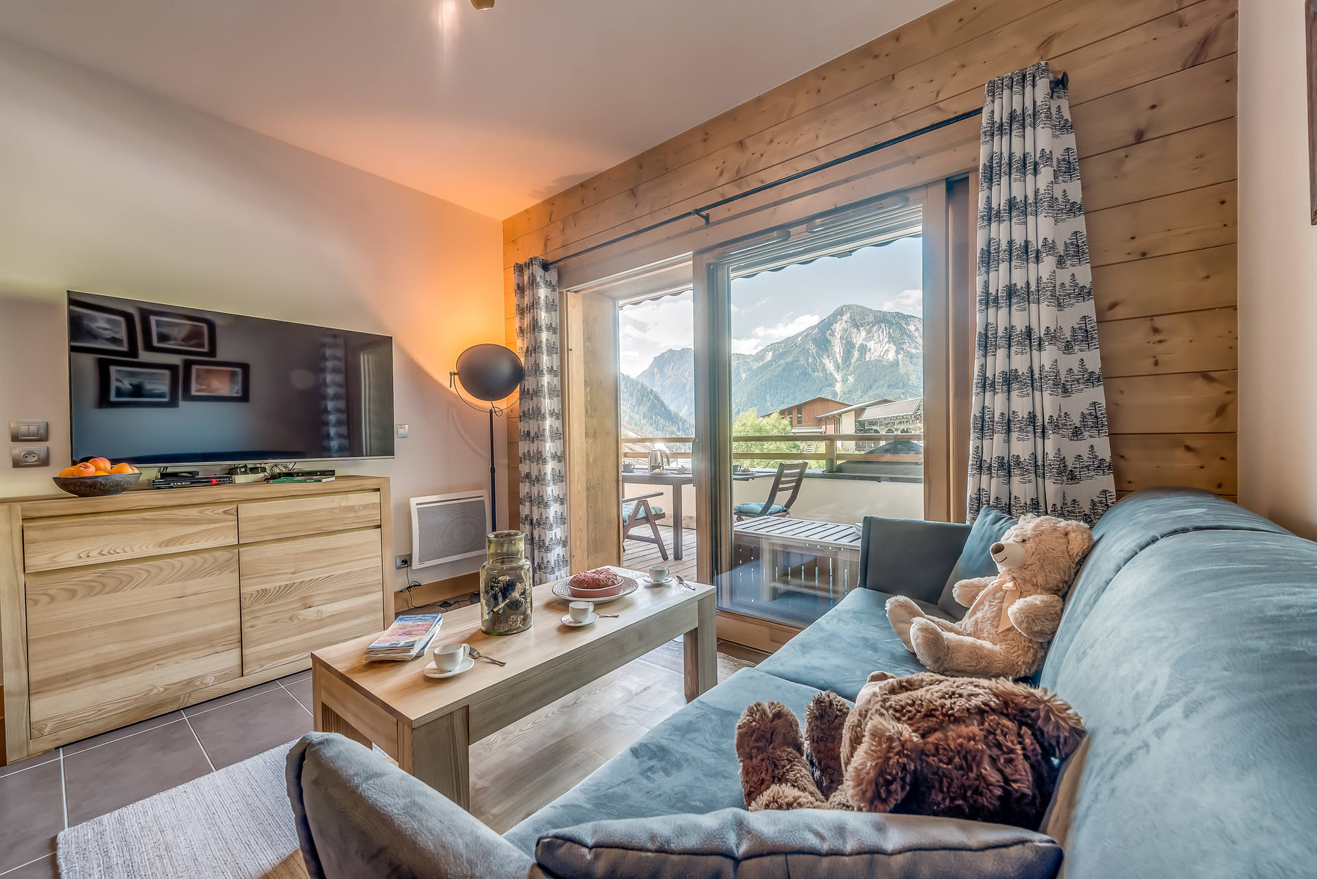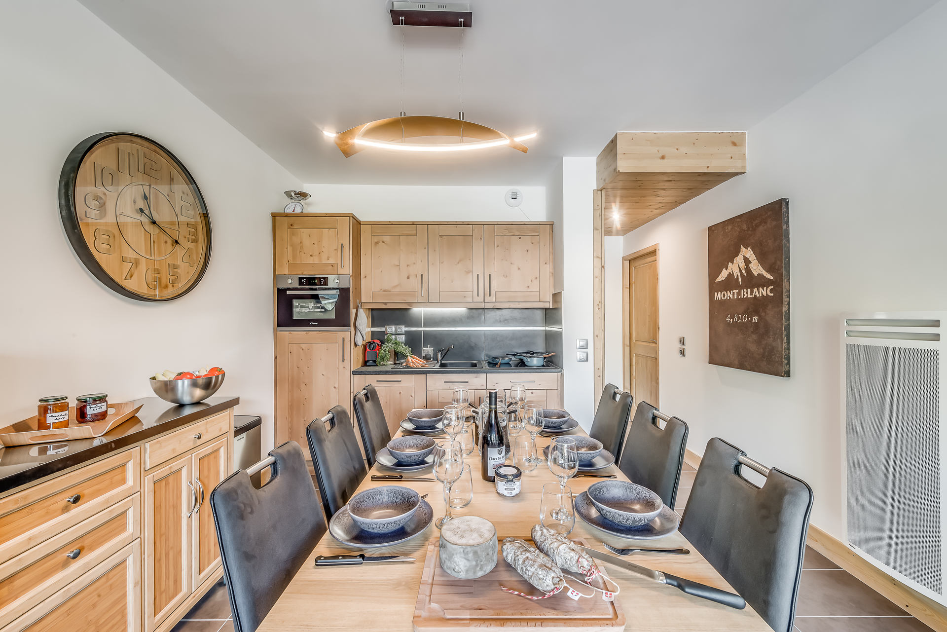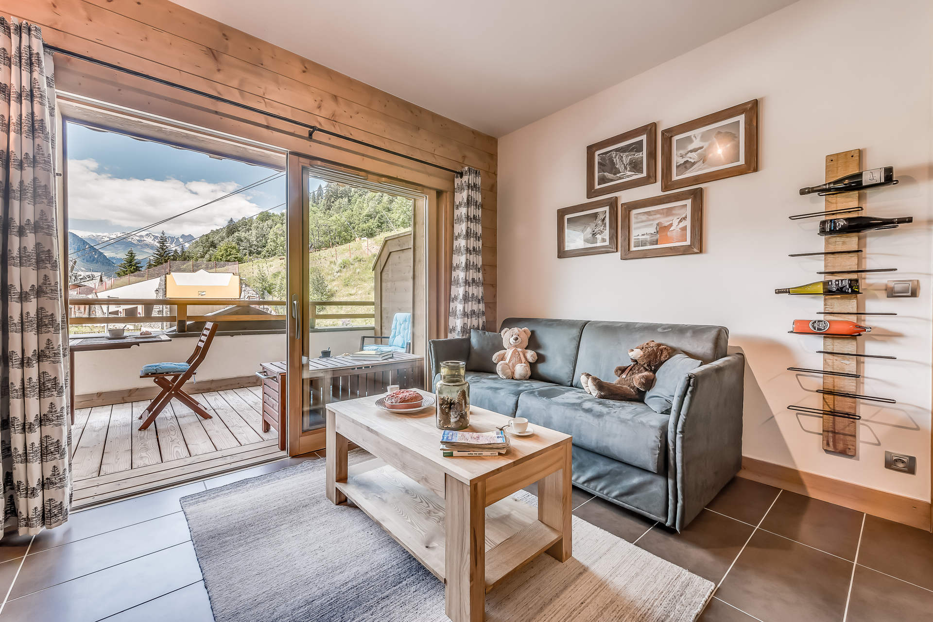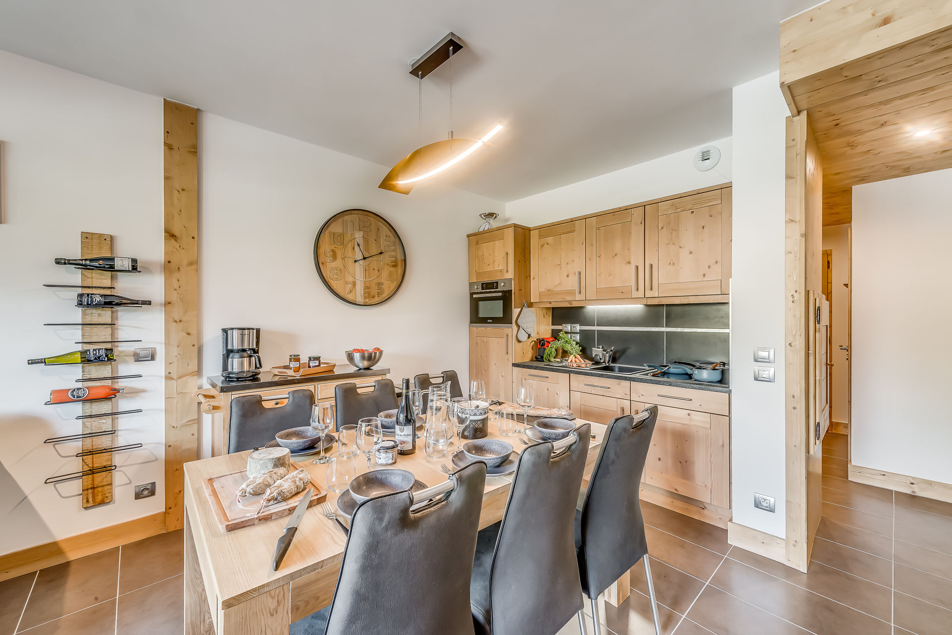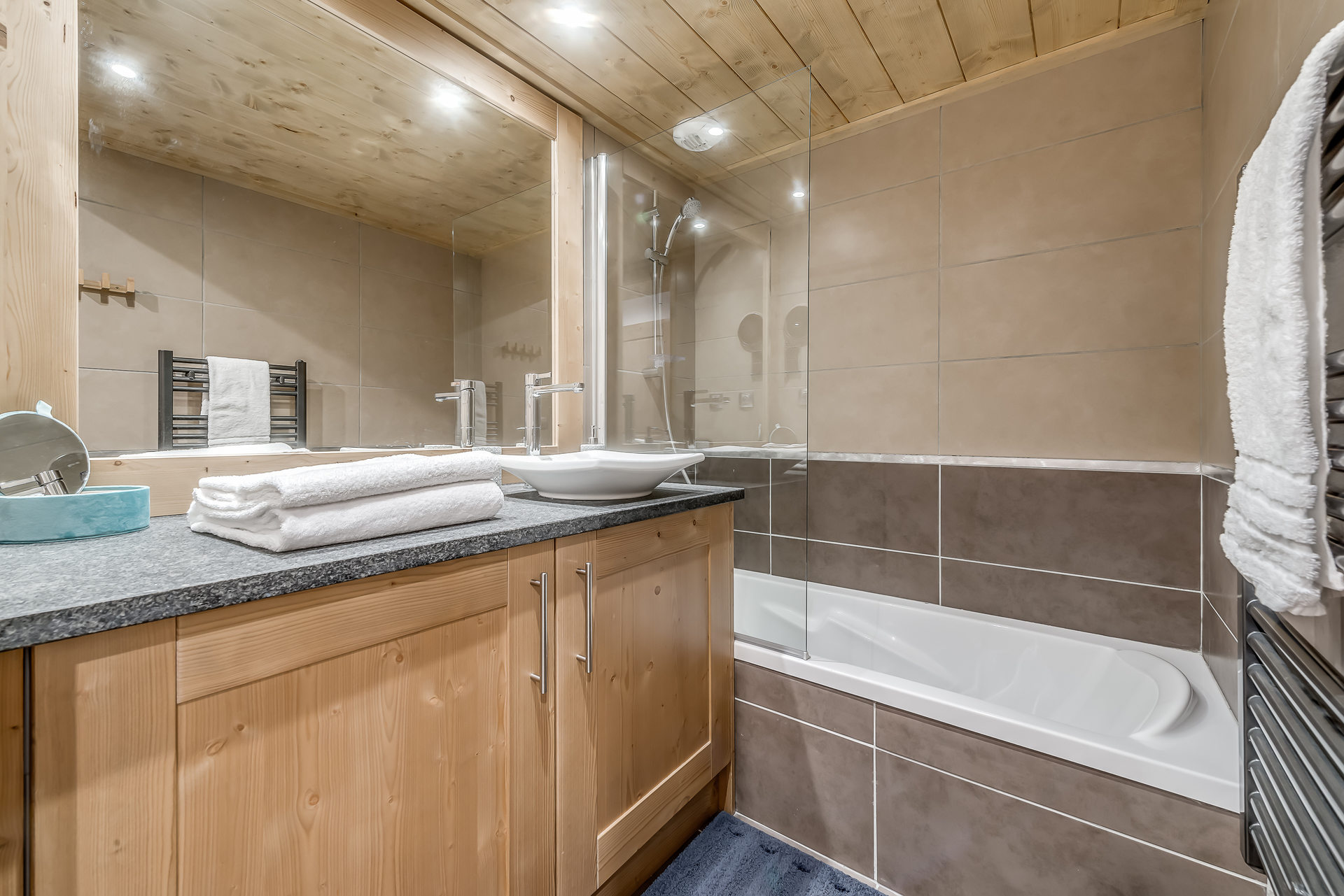 Il est composé d'un séjour avec balcon orienté Sud, d'une cuisine complètement équipée avec coin repas, de 2 chambres indépendantes, d'une salle de bains avec toilettes séparées et d'une salle de douche avec toilettes, d'une grande terrasse de 15 m2 totalement aménagée avec vue sur les montagnes et Courchevel.
